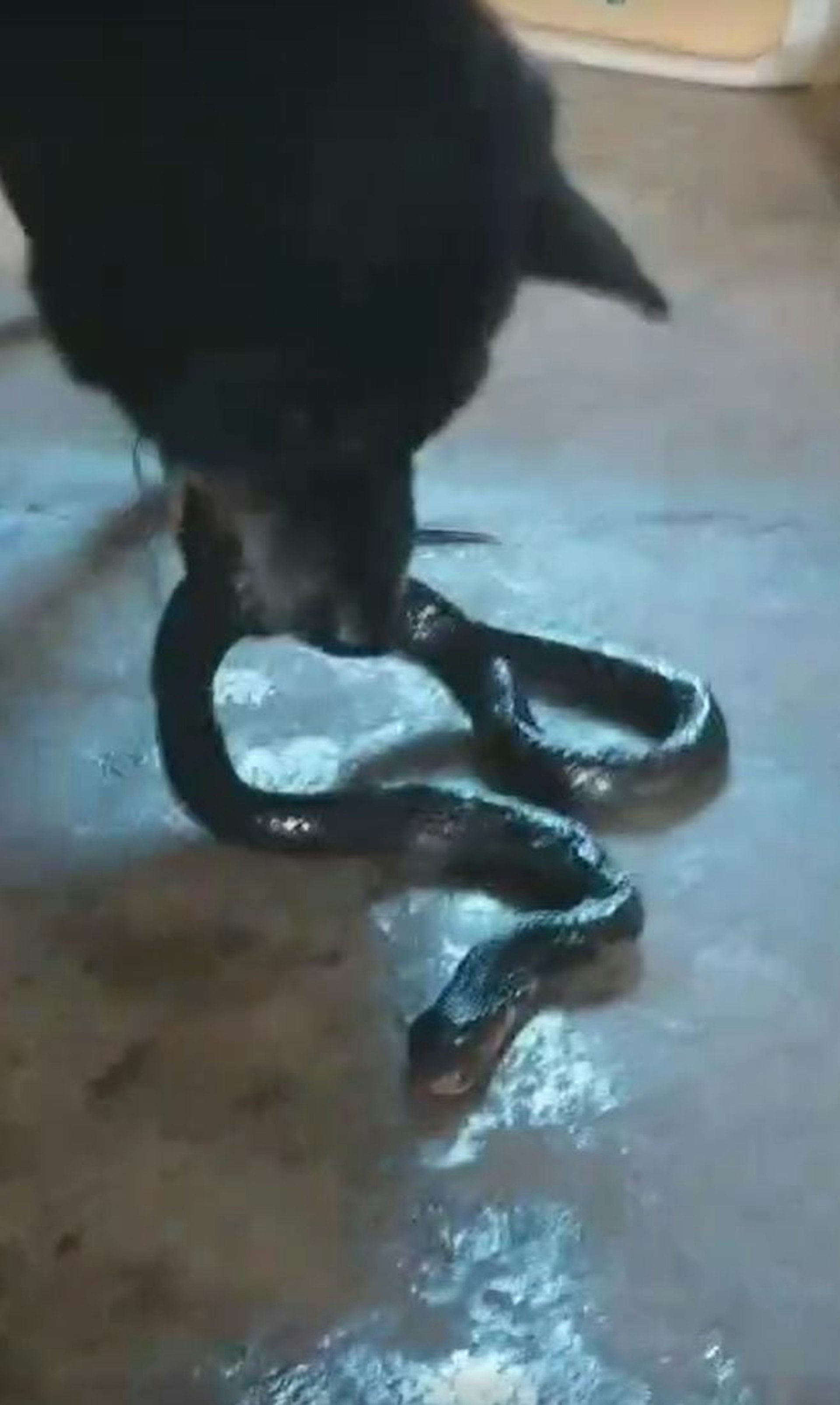 黑狗英勇大戰眼鏡蛇,只見大蛇被咬到奄奄一息,但黑狗仍不停張口猛咬,咬到蛇身都變形。(facebook群組「北區之友 Friends of North District (上水、粉嶺、沙頭角和打鼓嶺)」影片截圖)