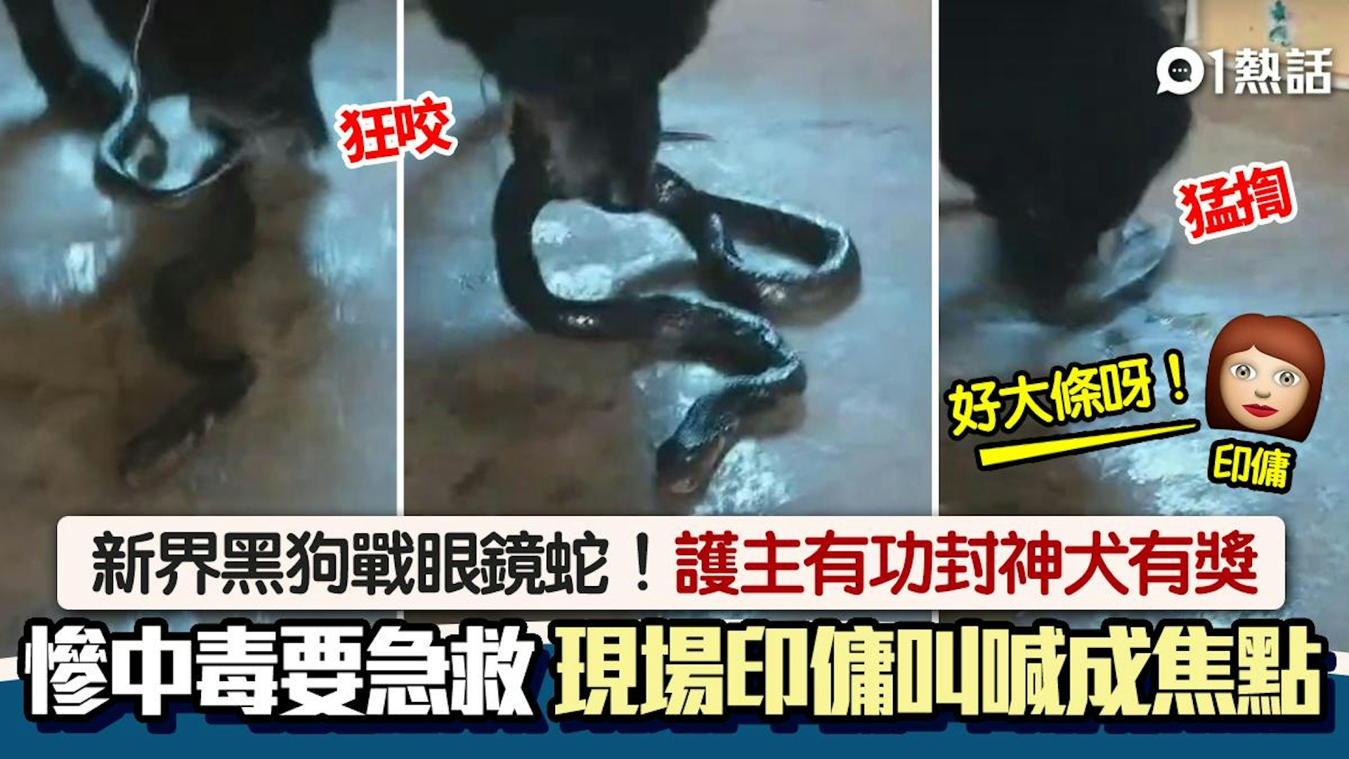 「汪星人」是人類最忠心的朋友,見到危險總會努力護主。有港男在網上上載影片,顯示其家中黑狗英勇大戰眼鏡蛇(俗稱「飯鏟頭」),只見大蛇被咬到奄奄一息,但黑狗仍不停張口猛咬,咬到蛇身都變形。現場有印傭嚇得不輕,在鏡頭後重呼吸,不斷用半鹹唔廣東喊「好大條呀!」,又疑用國語喘氣說:「嚇得啊!」。港男指寵物犬事後慘中毒,幸得動物保護組織「流浪狗之家」相助,「半夜幫神犬打針」,黑狗翌日已經無礙,並獲獎勵吃最愛的雞肉條。