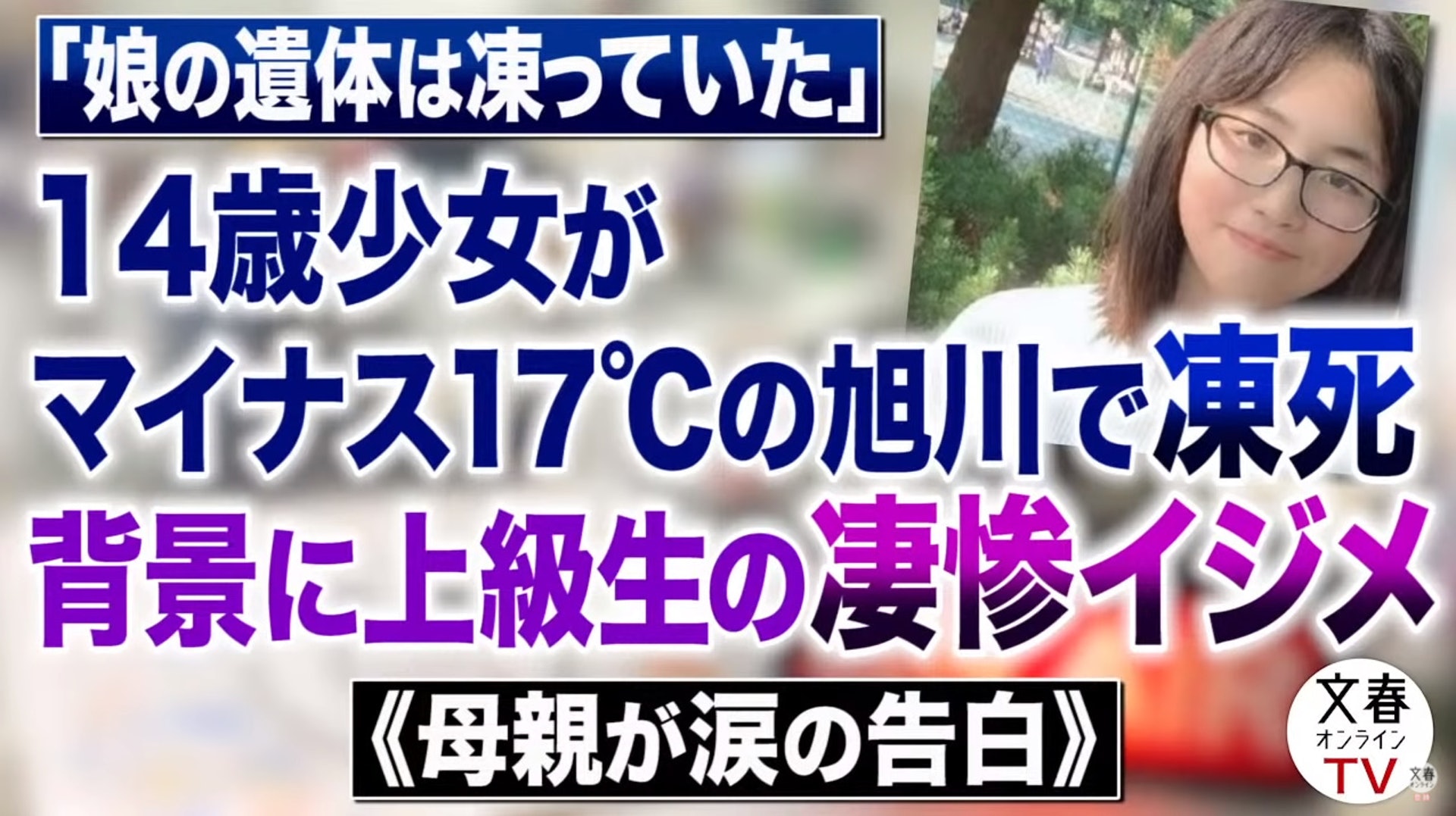- W! x( c, K8 H% z, q# g6 i今年3月下旬,居住在日本北海道旭川的14歲少女被發現倒臥在公園內,當時氣溫只有零下17度,死者身穿單薄的衣服,被冰凍的積雪活埋慘死。她的母親證實遺體是失蹤近一個月的女兒廣瀬爽彩,雖然案件還未查明是否屬於「自殺」,但卻令可怕的校園欺凌及性侵事件真相浮出水面。os.tvboxnow.com0 ]7 w9 U/ j, f