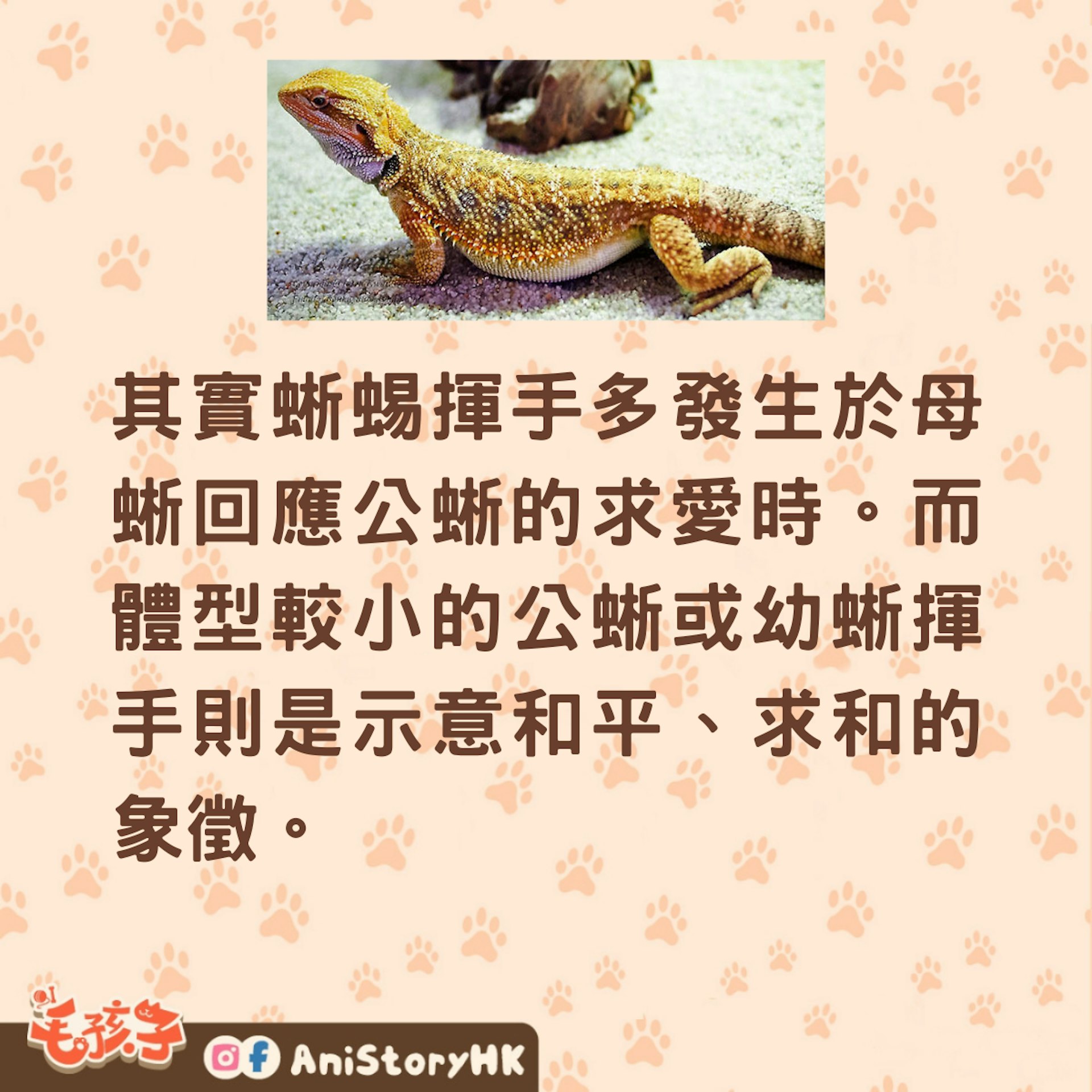 有時蜥蜴會將一隻手伸向空中並作出揮舞的動作,就如同是在和誰打招呼一般。其實蜥蜴揮手多發生於母蜥回應公蜥的求愛時。而體型較小的公蜥或幼蜥揮手則是示意和平、求和的象徵。