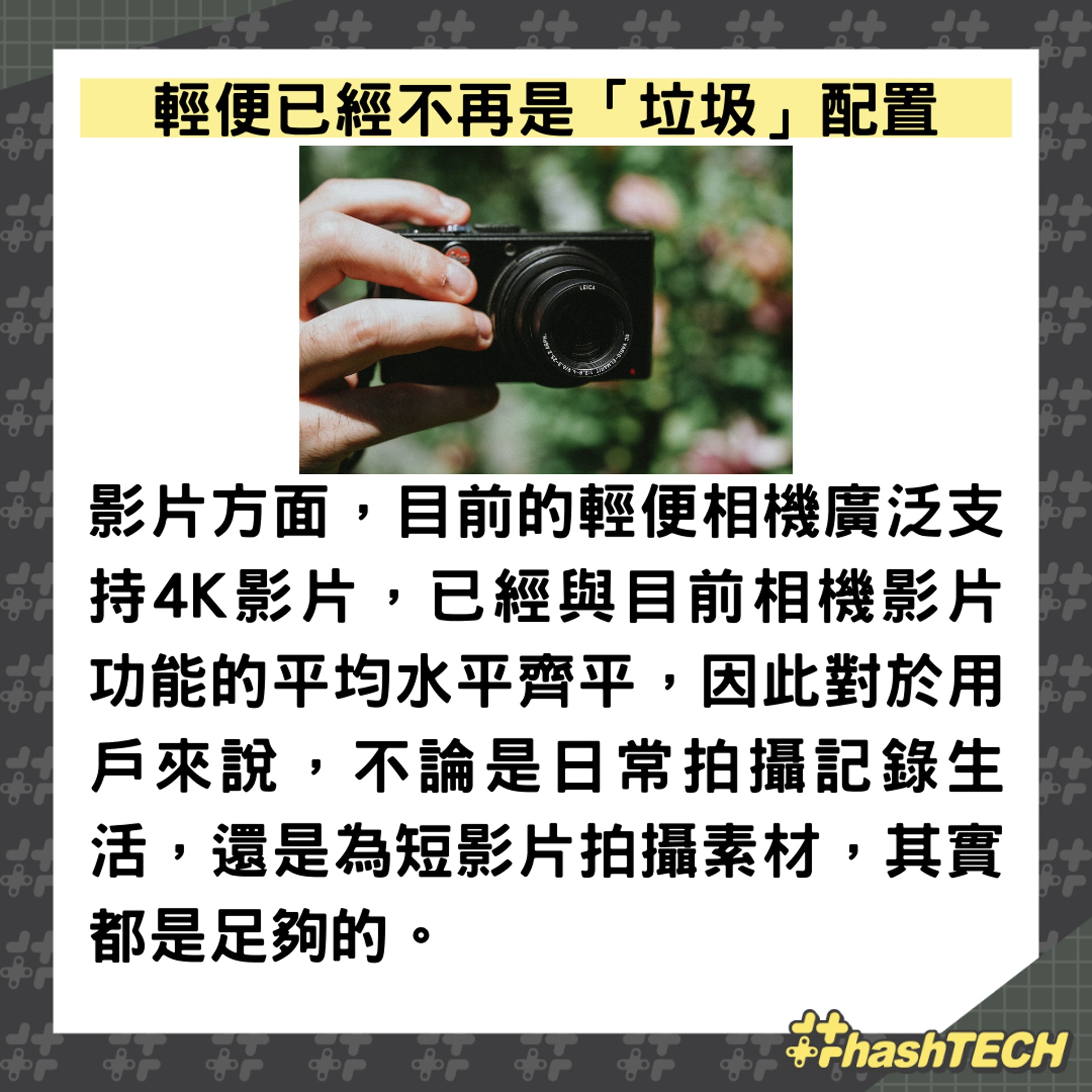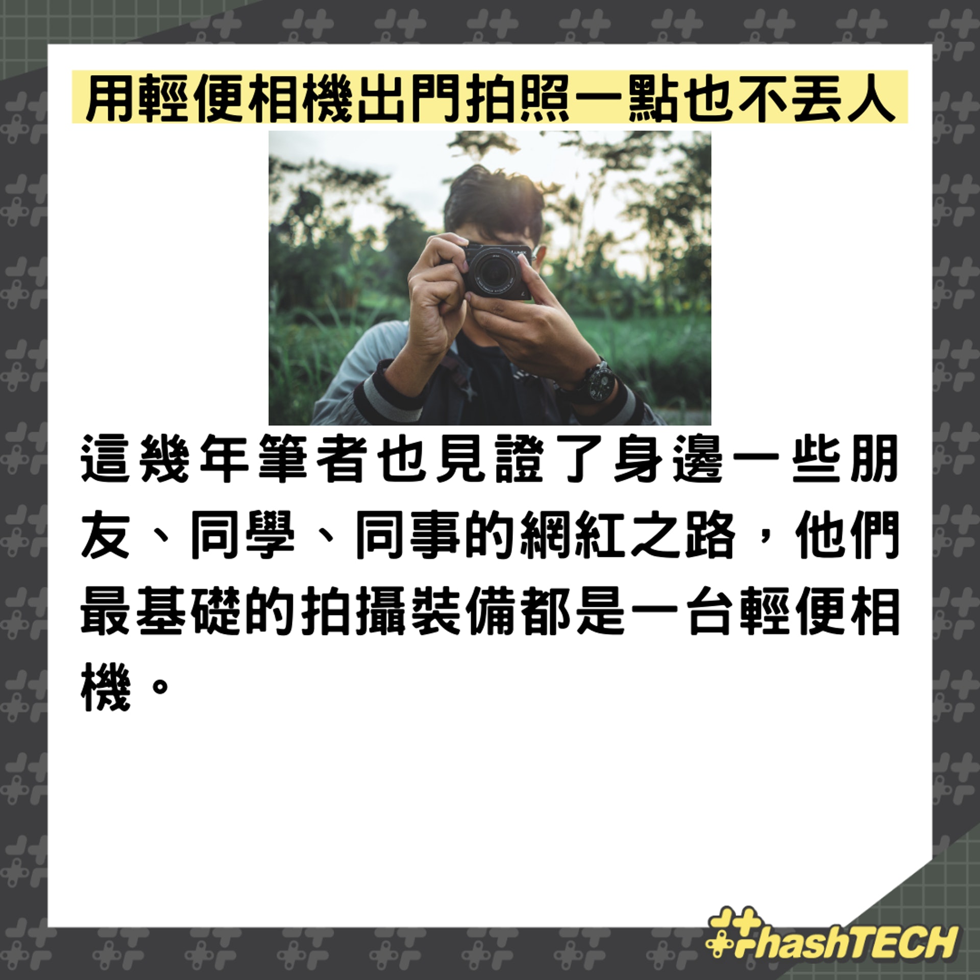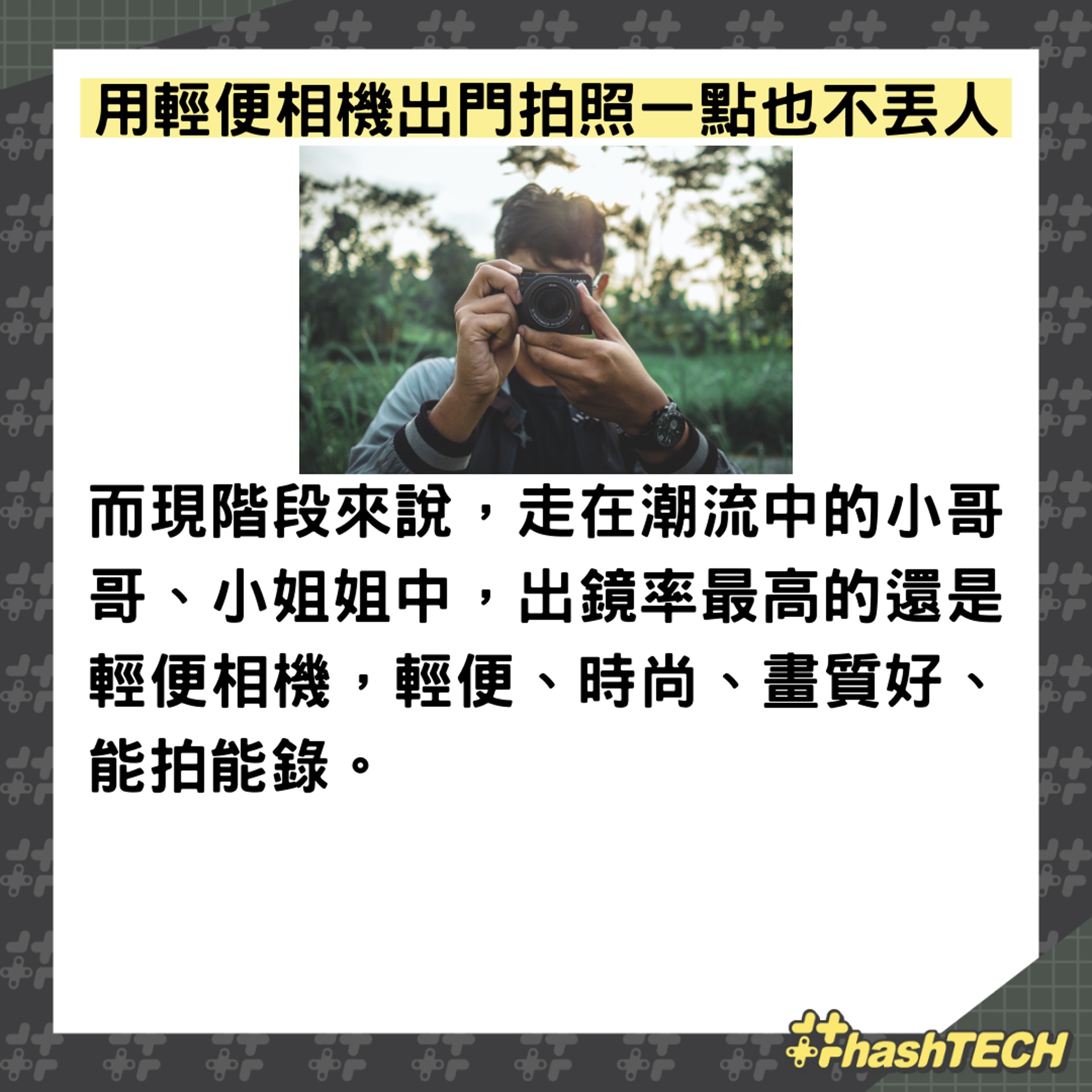 而現階段來說,走在潮流中的小哥哥、小姐姐中,出鏡率最高的還是輕便相機,輕便、時尚、畫質好、能拍能錄。那麼問題來了,你願意拿著輕便相機出門拍照嗎? |
