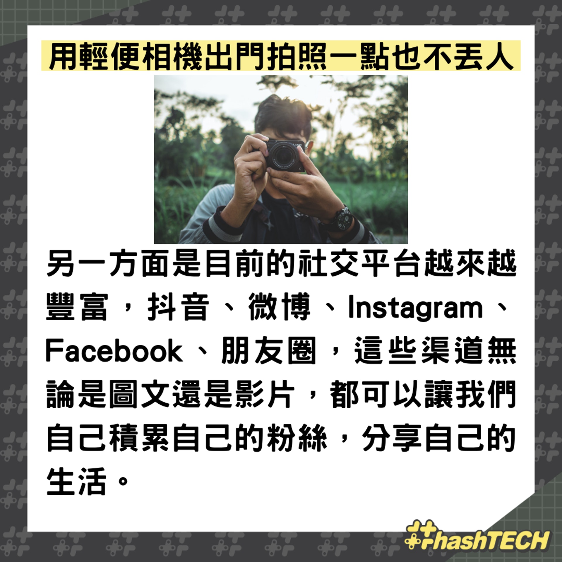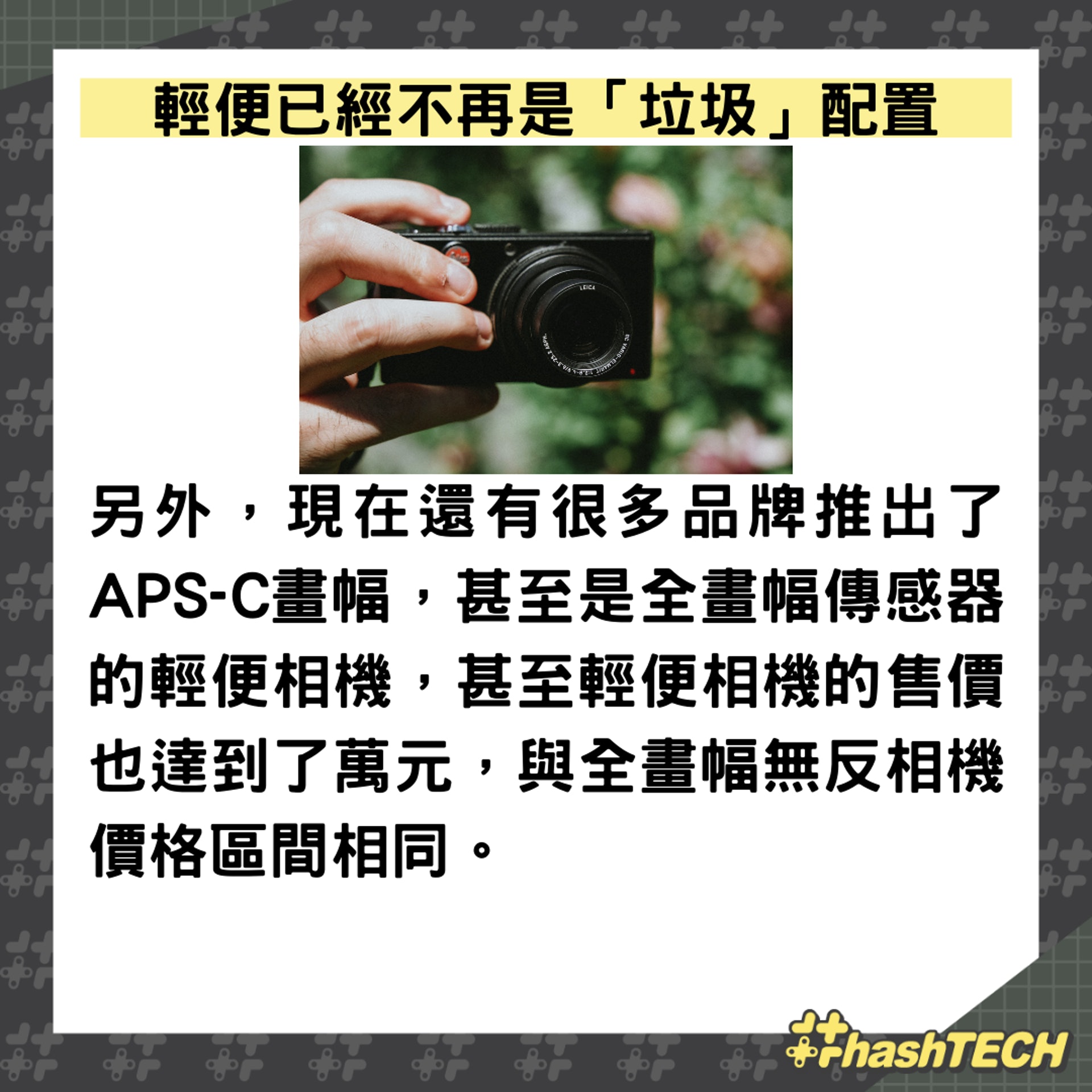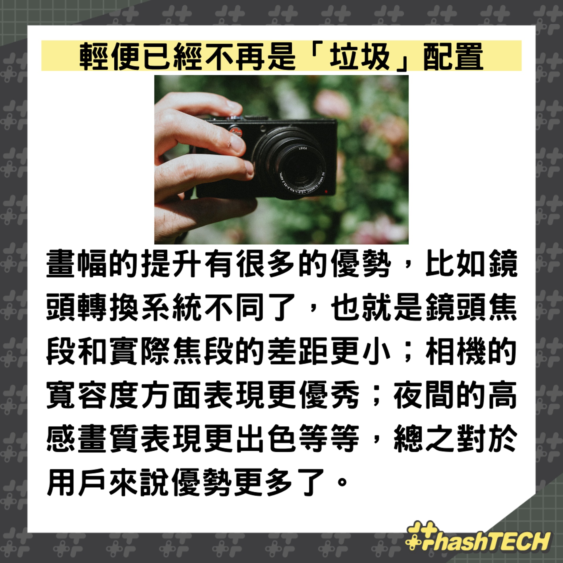 而現階段來說,走在潮流中的小哥哥、小姐姐中,出鏡率最高的還是輕便相機,輕便、時尚、畫質好、能拍能錄。那麼問題來了,你願意拿著輕便相機出門拍照嗎? |