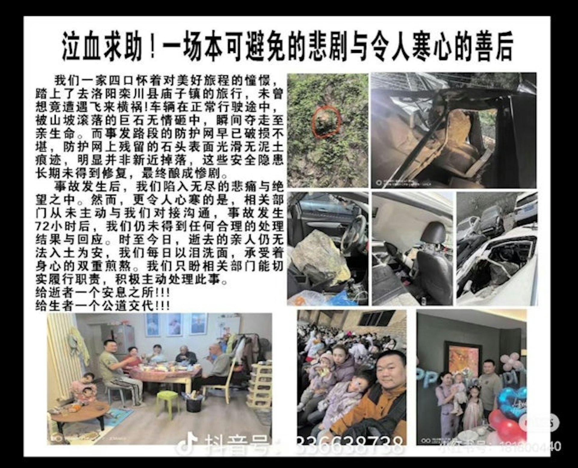 據早前報道,田先生的母親譚女士稱,5月1日晚上,兒子一家四口從洛陽出發開車前往欒川縣老君山景區,翌日晚上從景區回到民宿途中遇到落石,直接砸到頭頂,當場不治,遺下兩名分別2歲多及8歲的女兒,「我兒子是獨生子。我們是白髮人送黑髮人」。os.tvboxnow.com6 P0 e9 D N- C0 W$ Y