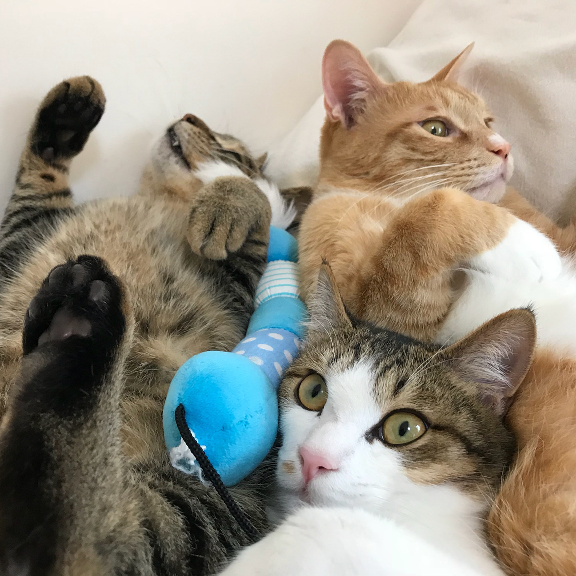 3隻貓咪平日最喜歡的事,當然就是吃和睡。但牠們感情實在太好了,差不多每次睡覺時,都是緊緊地擠在一起,像是一刻也不願分離。當然,睡醒時牠們的感情也相當不錯,互相嬉戲打交,根本就是日常事。