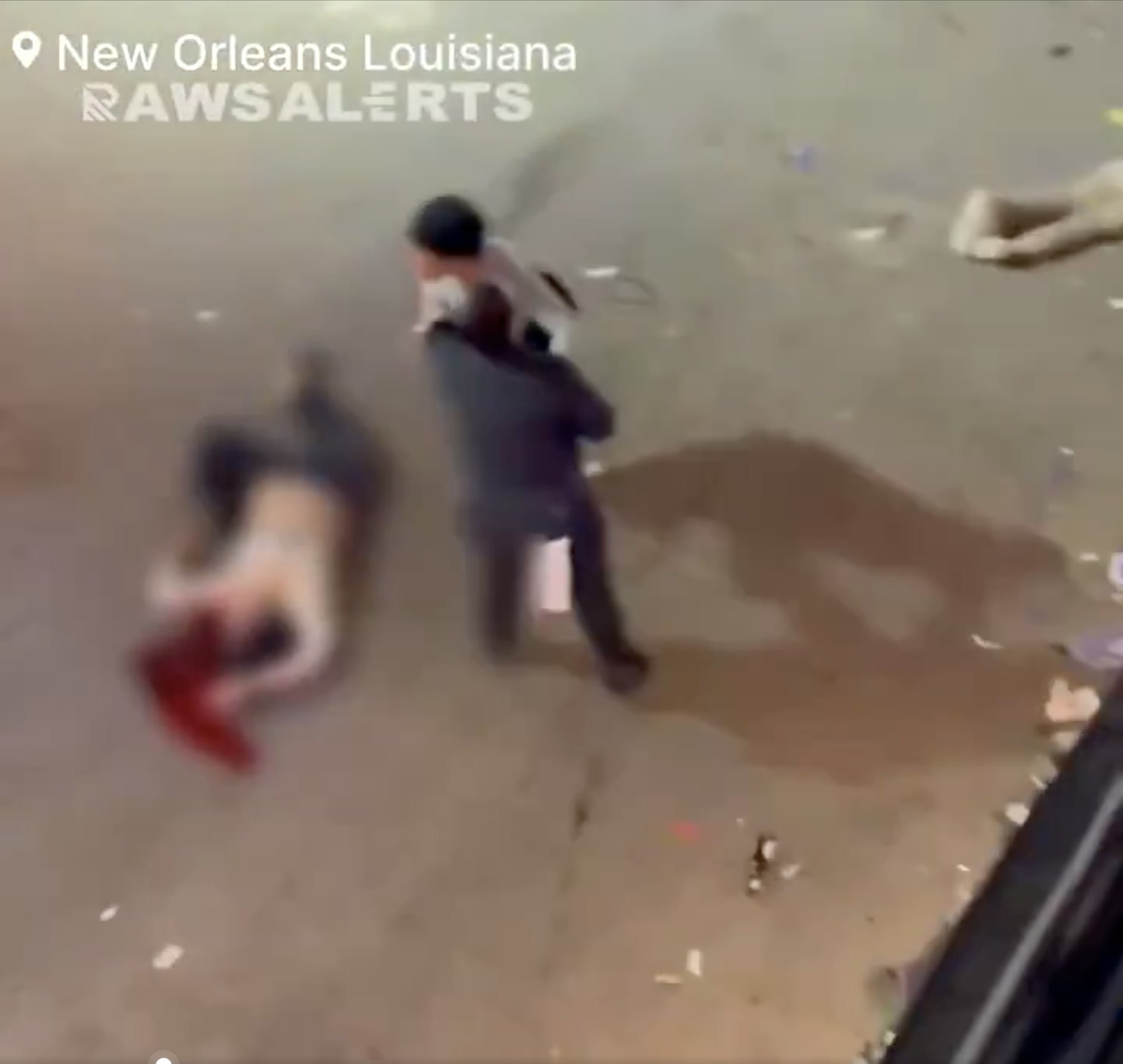 9 o N) t8 ] \3 ]' K: ?2 j4 _綜合美媒報道,美國時間1月1日凌晨時分,一輛車輛高速撞向新奧爾良市(New Orleans)法國區波旁街(Bourbon Street)上的行人,造成至少10死30傷。圖為疑似事發現場,有人中槍倒地。(X@ThomaMore)