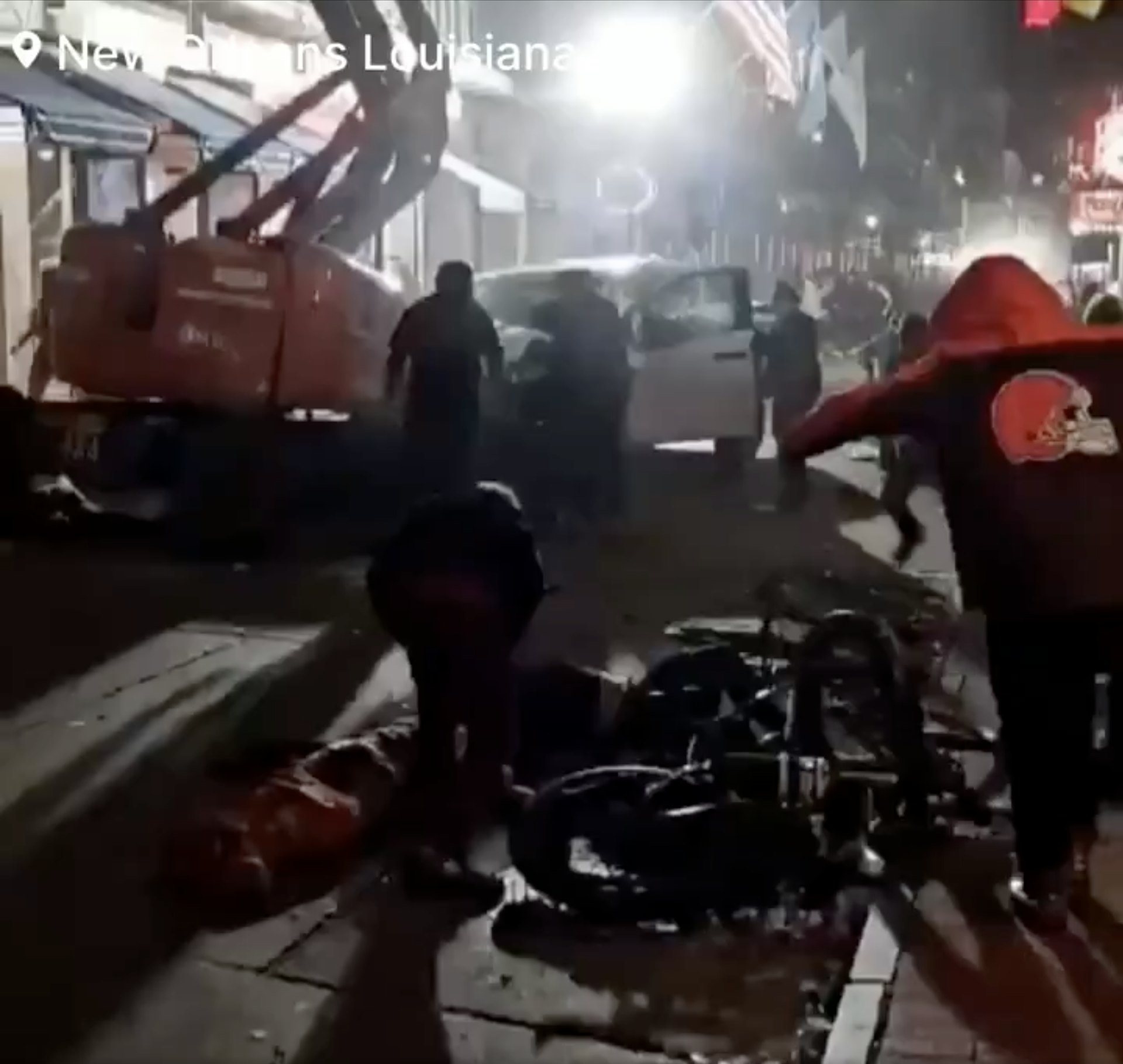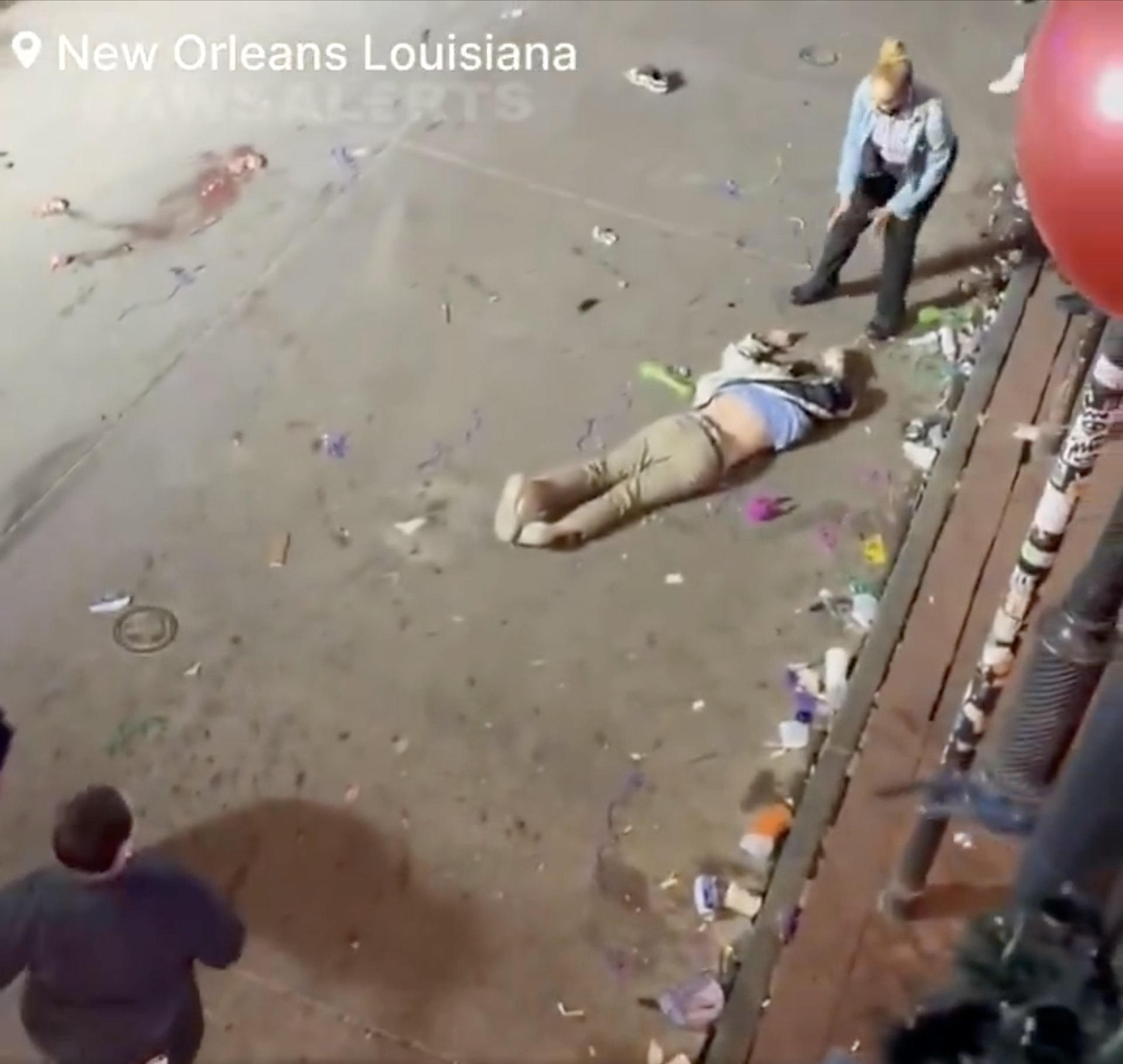 9 L$ x% B9 @6 f5 h6 K1 z公仔箱論壇綜合美媒報道,美國時間1月1日凌晨時分,一輛車輛高速撞向新奧爾良市(New Orleans)法國區波旁街(Bourbon Street)上的行人,造成至少10死30傷。圖為疑似事發現場,有人受傷倒地。(X@ThomaMore)