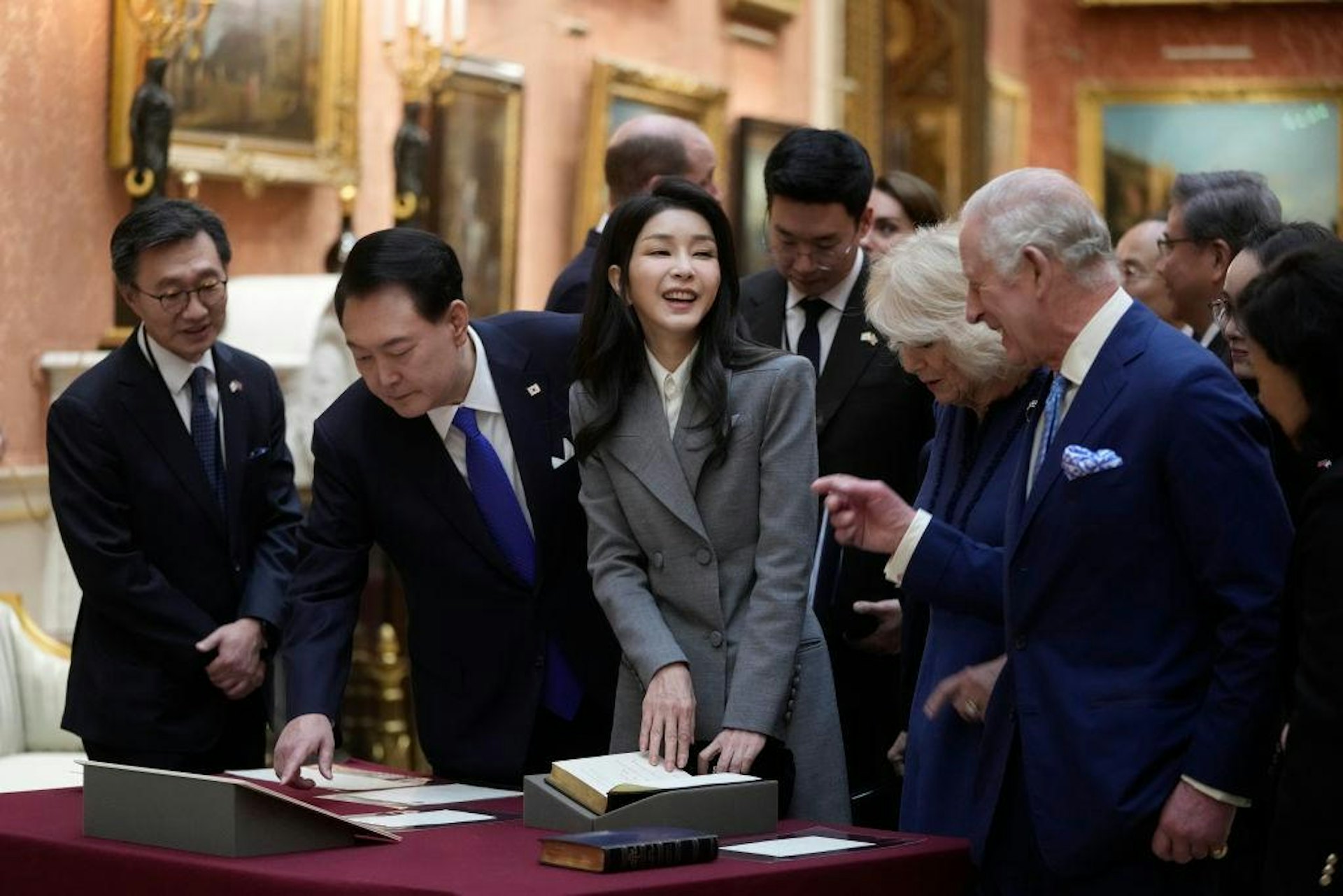 : G& v8 H. M/ Y: \. |os.tvboxnow.com2023年11月21日,英國倫敦,圖為韓國總統尹錫悅與第一夫人金建希訪問英國,英王查理斯三世與卡米拉王后陪同他們遊覽白金漢宮。(Reuters)公仔箱論壇$ f/ y# [3 @8 V. J
