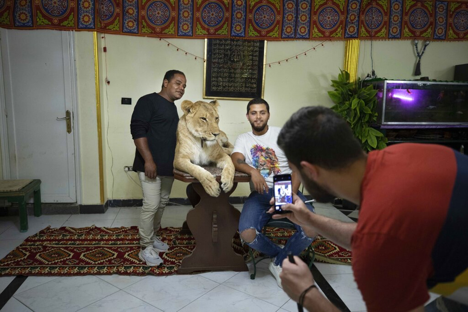 $ j7 ]' ?8 q. [$ ~" f7 wos.tvboxnow.com圖為4月28日,圖為埃及一個國營馬戲團在完成表演後,團中工作人員與一頭雌性獅子合照。(AP)