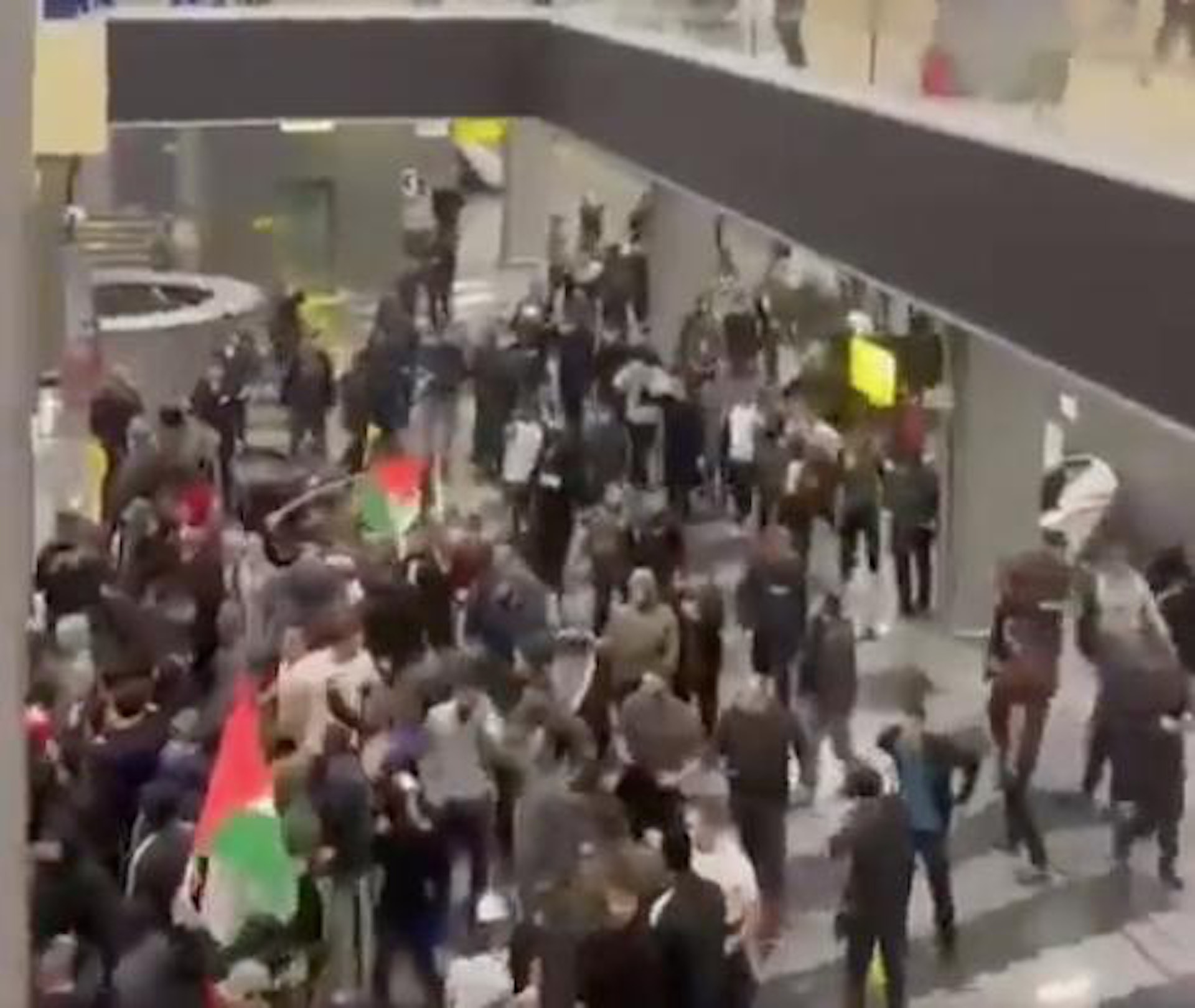 數百名支持巴勒斯坦的示威者2023年10月29日強行闖入位於俄羅斯南部達吉斯坦(Dagestan)地區的馬哈奇卡拉機場(Makhachkala airport),反對以色列客機降落,以及尋找以色列人和猶太人,機場被迫關閉。路透社取得的影片截圖顯示,當親巴勒斯坦示威者衝進馬哈奇卡拉機場一大樓。 (Reuters)