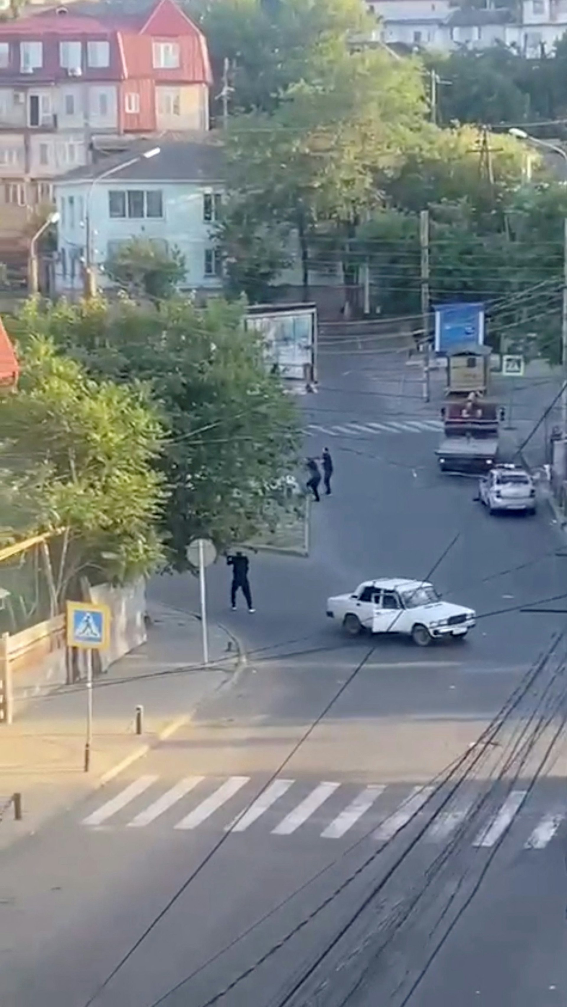 7 R7 Y% V( C. N1 f公仔箱論壇位於俄羅斯南部北高加索地區的達吉斯坦(Dagestan)2024年6月23日多處發生恐襲,包括一猶太教堂、一東正教教堂和警察局受襲。圖為現場影片顯示,馬哈奇卡拉(Makhachkala)一街道發生襲擊,現場爆發槍戰,被攝錄鏡頭拍下。(REUTERS/via REUTERS)( s- K+ j* z4 ?