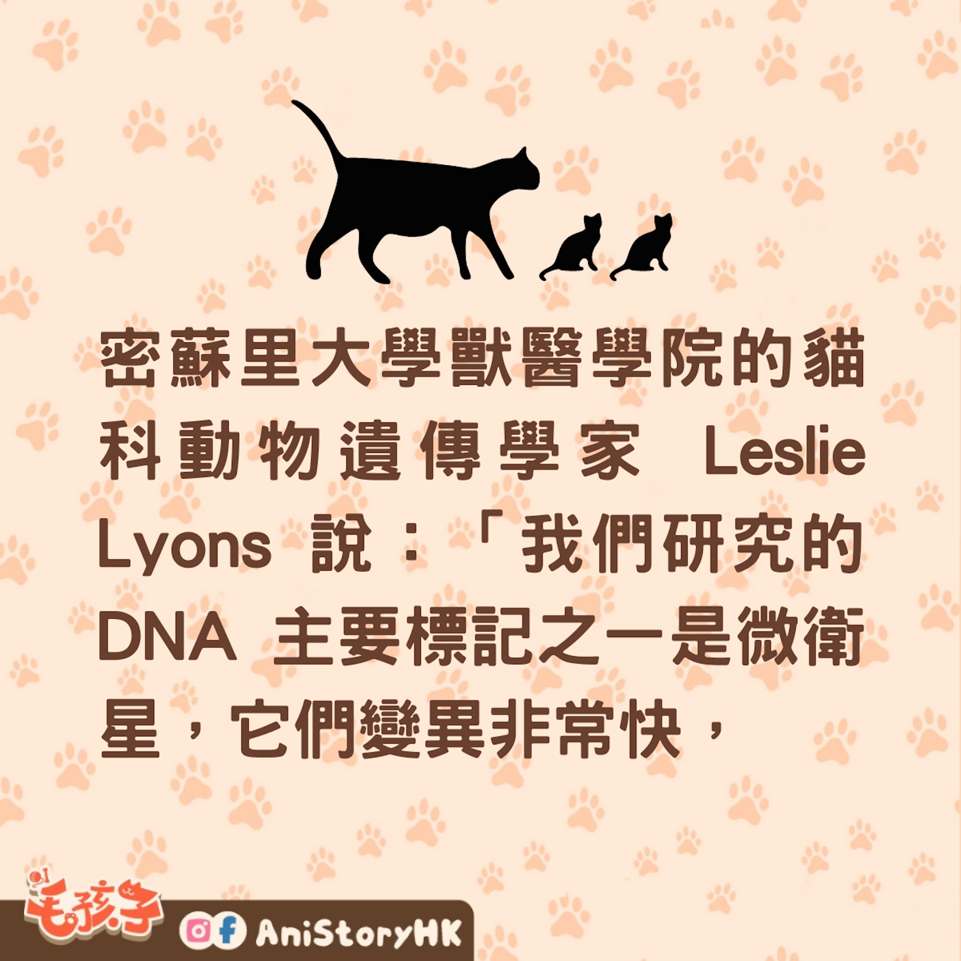 密蘇里大學獸醫學院的貓科動物遺傳學家 Leslie Lyons 說:「我們研究的 DNA 主要標記之一是微衛星,它們變異非常快,並為我們提供了有關最近幾百年貓科動物種群和品種發展的線索。且我們檢查的另一個關鍵 DNA 標記是單核苷酸多態性,它是遍佈整個基因組中的單個變化,為我們提供了關於它們在數千年前的古老歷史線索。」