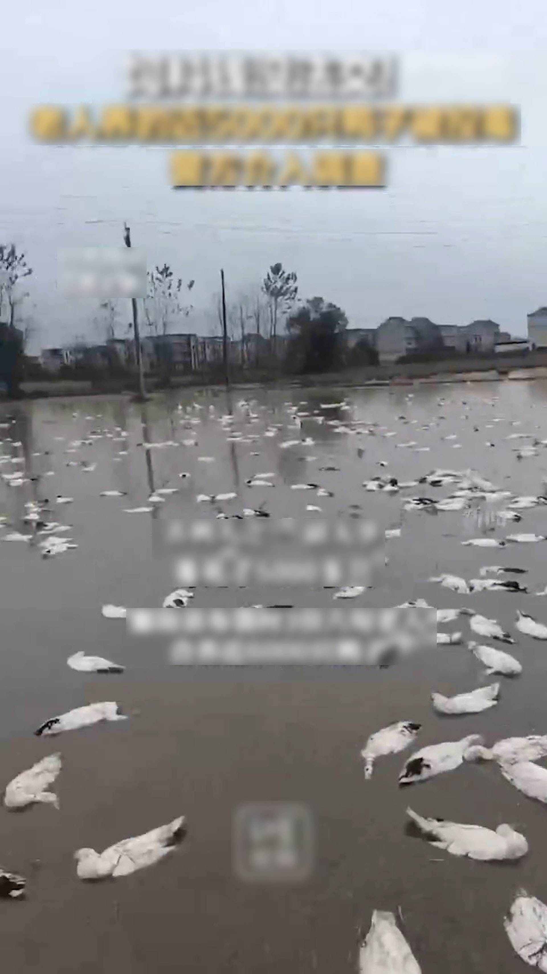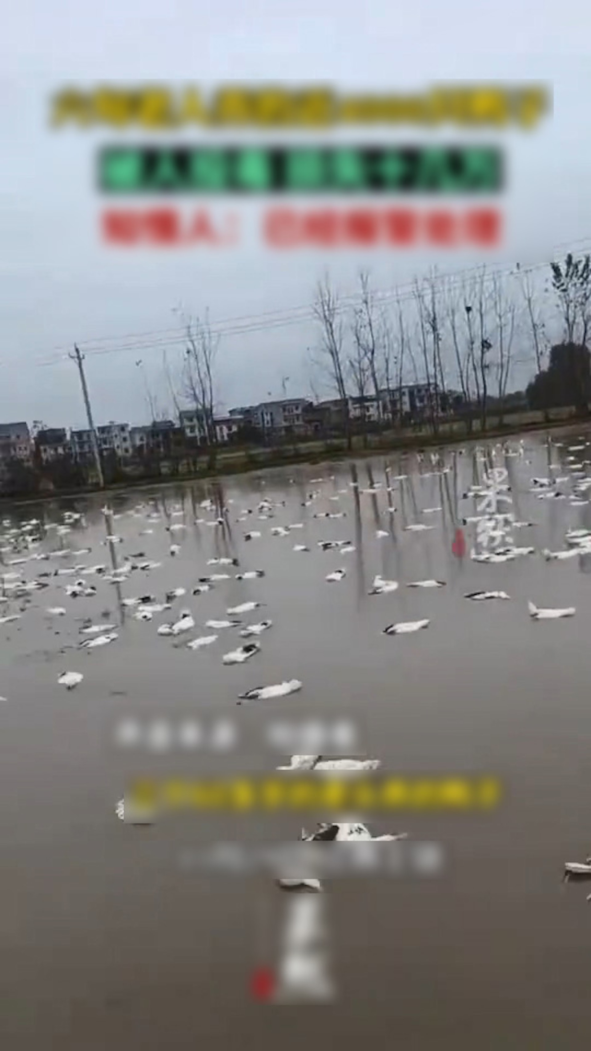 池子一片片白色,許多鴨子被毒死後浮在水面。(微博影片截圖)