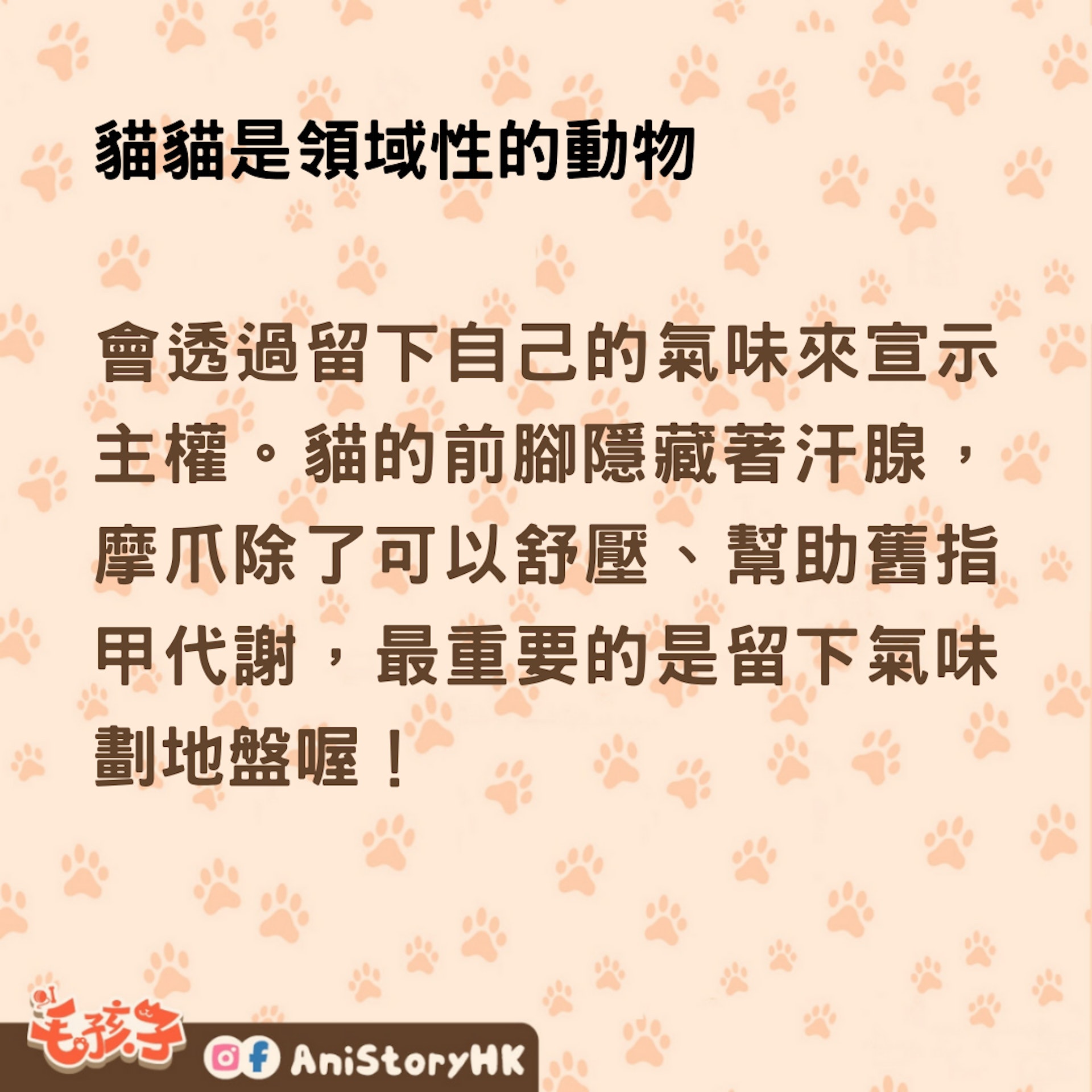 ​​會透過留下自己的氣味來宣示主權。​​貓的前腳隱藏著汗腺,​​摩爪除了可以舒壓、幫助舊指甲代謝,​​最重要的是留下氣味 劃地盤喔!
