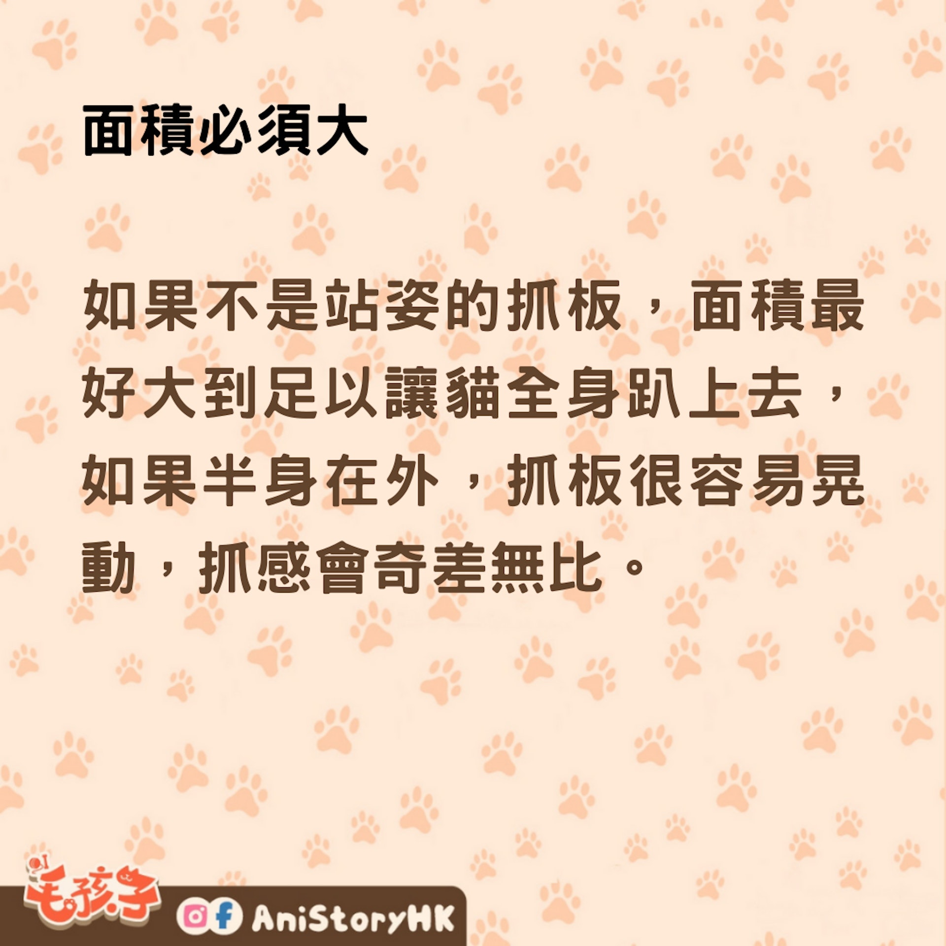 ​​如果不是站姿的抓板,​​面積最好大到足以讓貓全身趴上去,​​如果半身在外,抓板很容易晃動,​​抓感會奇差無比。