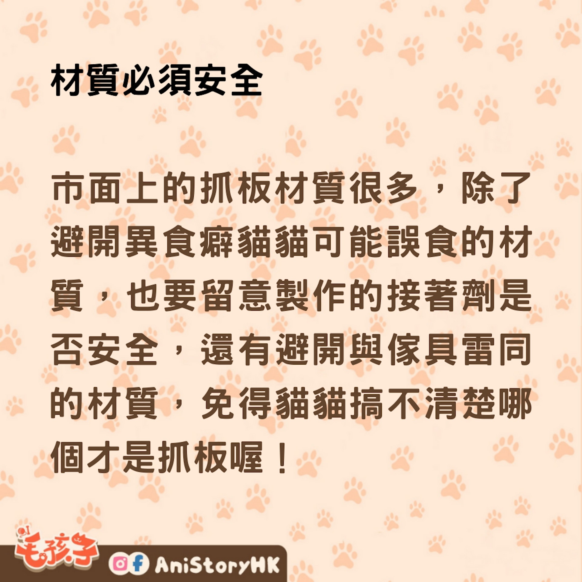 ​​市面上的抓板材質很多,​​除了避開異食癖貓貓可能誤食的材質,​​也要留意製作的接著劑是否安全,​​還有避開與傢具雷同的材質,​​免得貓貓搞不清楚哪個才是抓板喔!