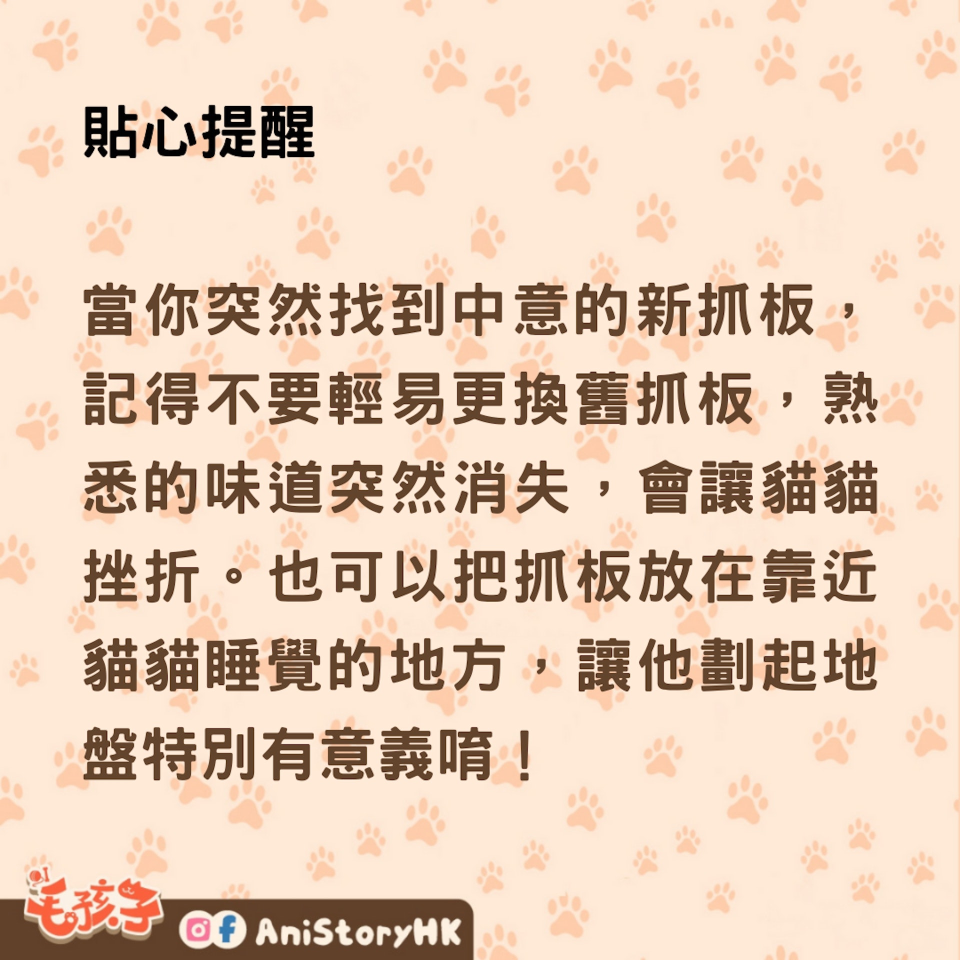 當你突然找到中意的新抓板,​​記得不要輕易更換舊抓板,​​熟悉的味道突然消失,會讓貓貓挫折。也可以把抓板放在靠近貓貓睡覺的地方,​​讓他劃起地盤特別有意義唷!