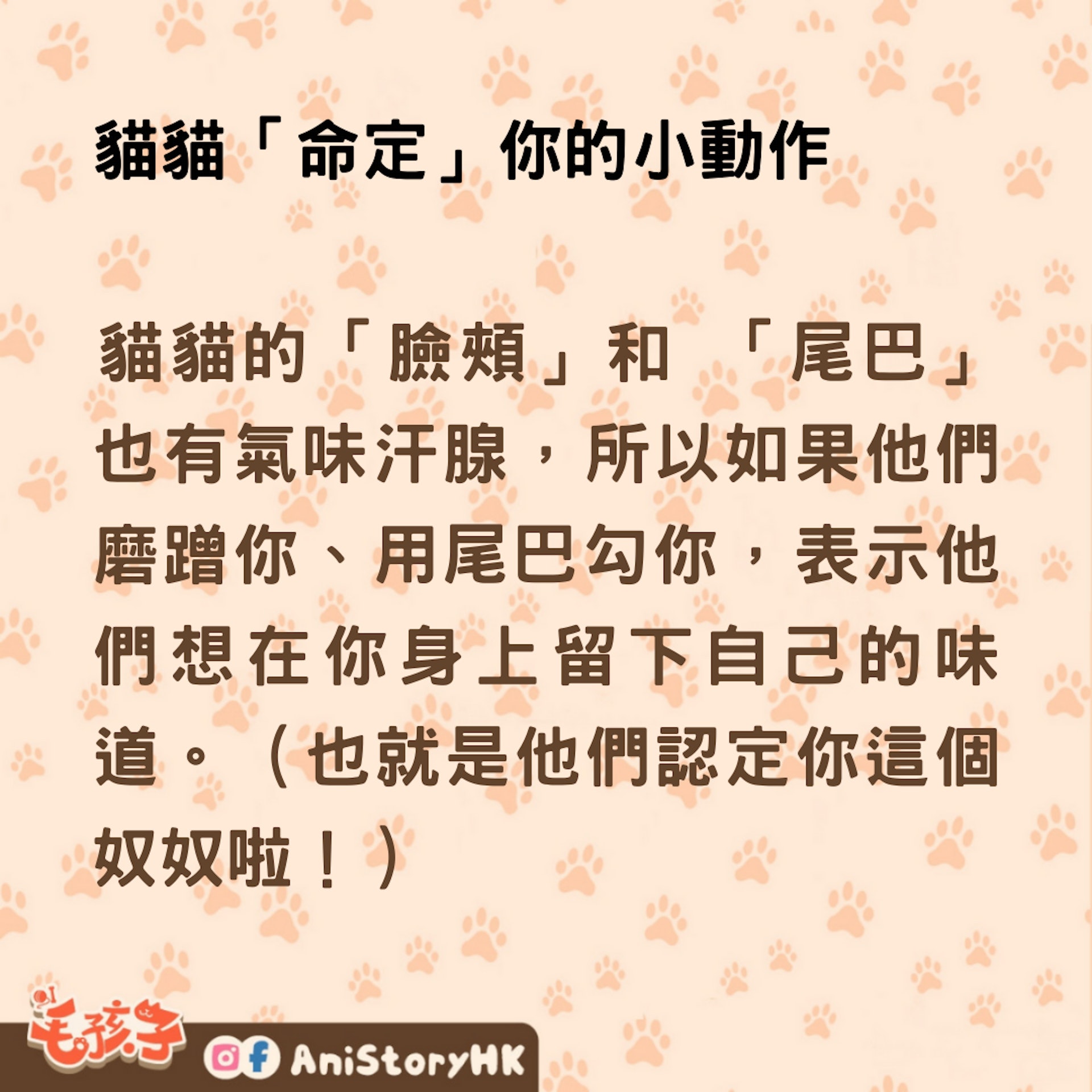 ​​貓貓的 「臉頰」和 「尾巴」 也有氣味汗腺,​​所以如果他們 磨蹭你、用尾巴勾你,​​表示他們想在你身上留下自己的味道。​​(也就是他們認定你這個奴奴啦!)