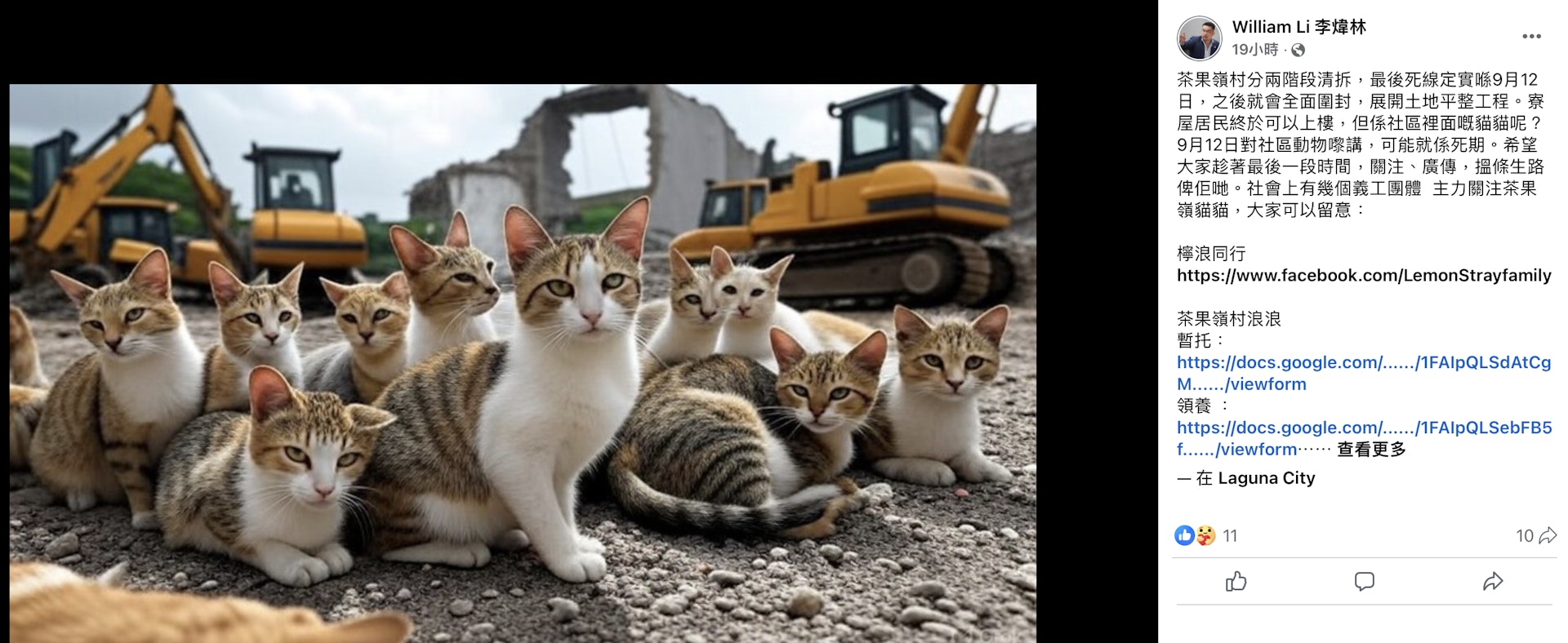 茶果嶺村清拆工程的最後期限定於9月12日,村內約400戶村民已經陸續遷出,但由於安置措施沒有涵蓋動物,村民所放養、散養、飼養的超過100隻流浪貓卻仍流離失所。(Facebook專頁「茶果嶺D貓」)