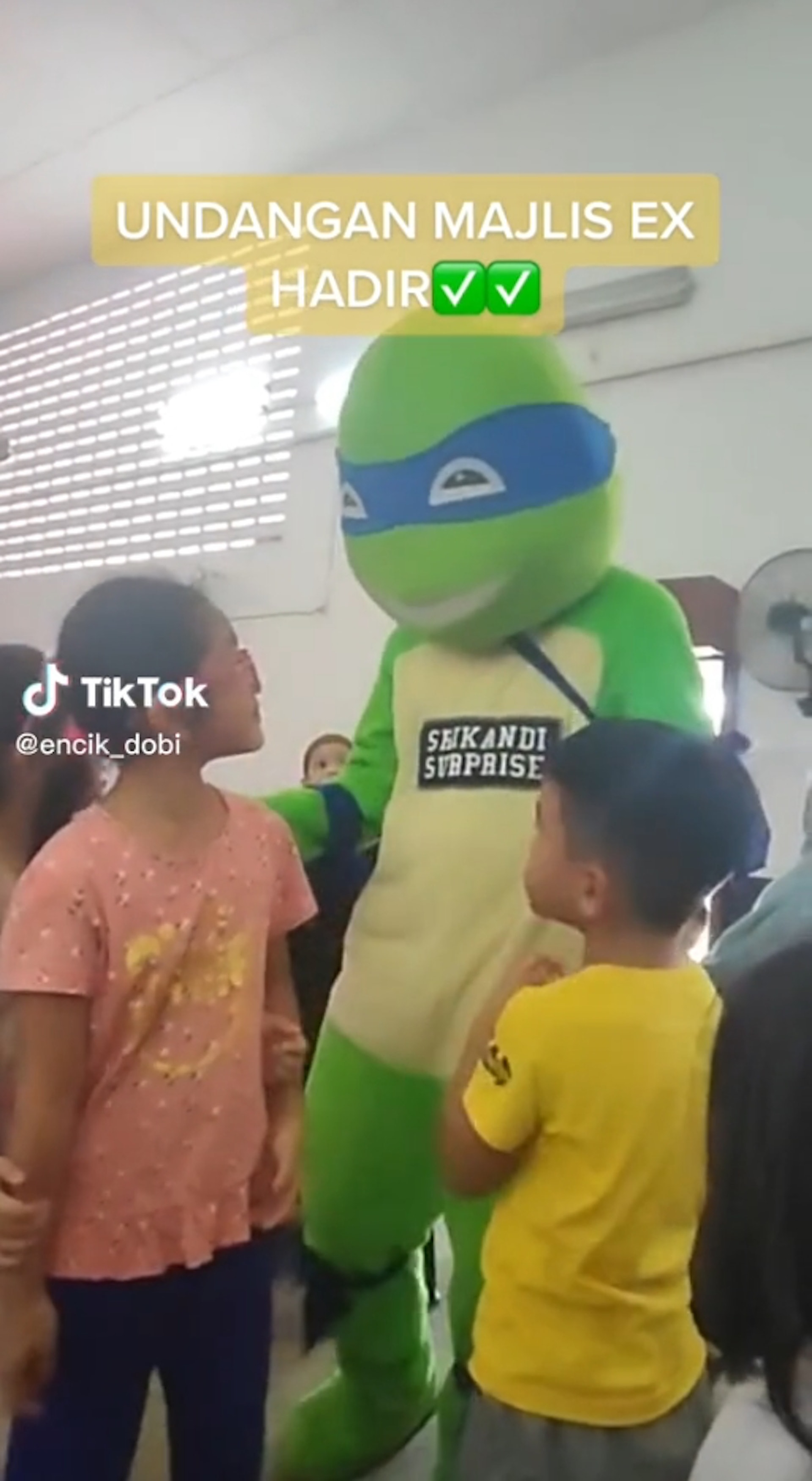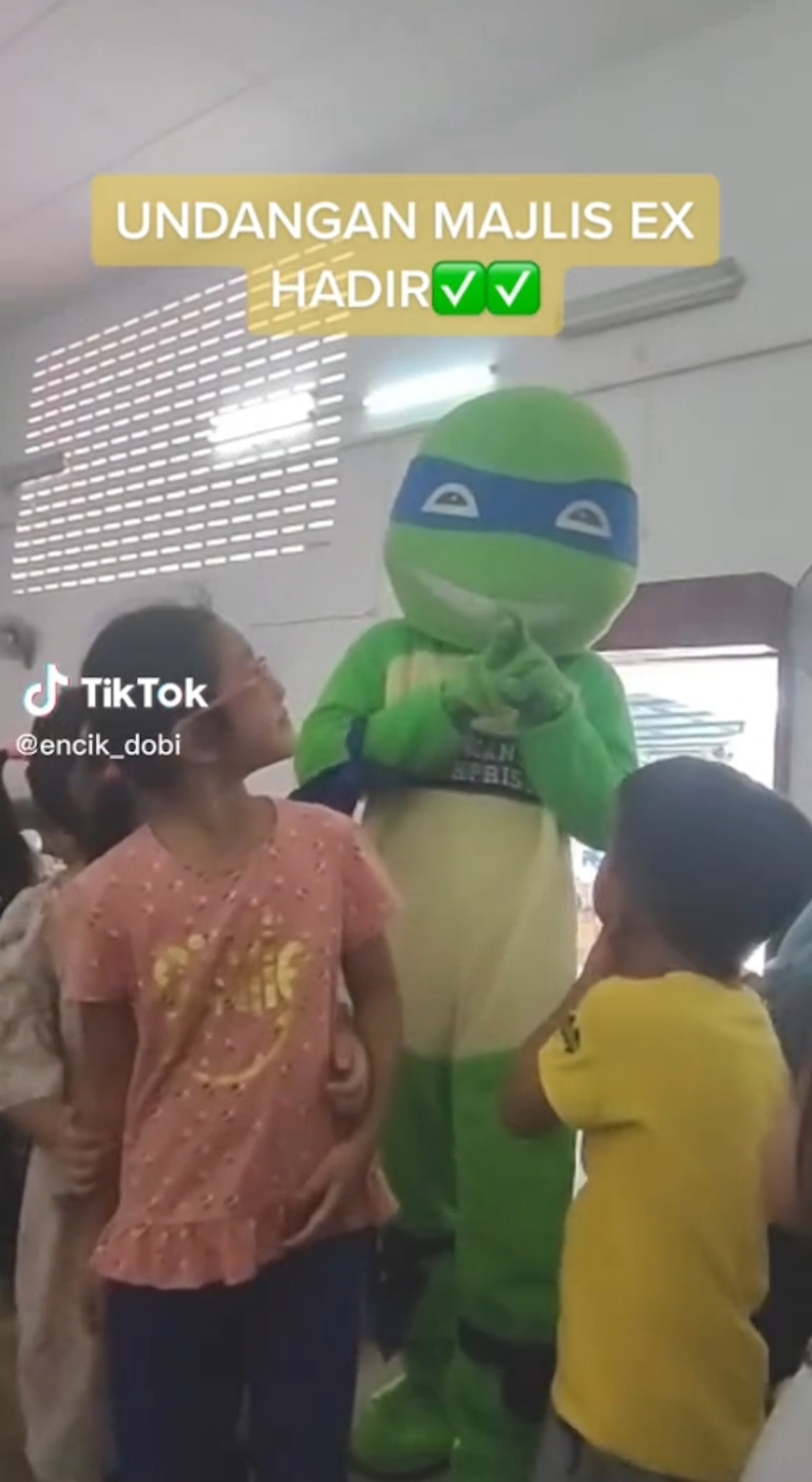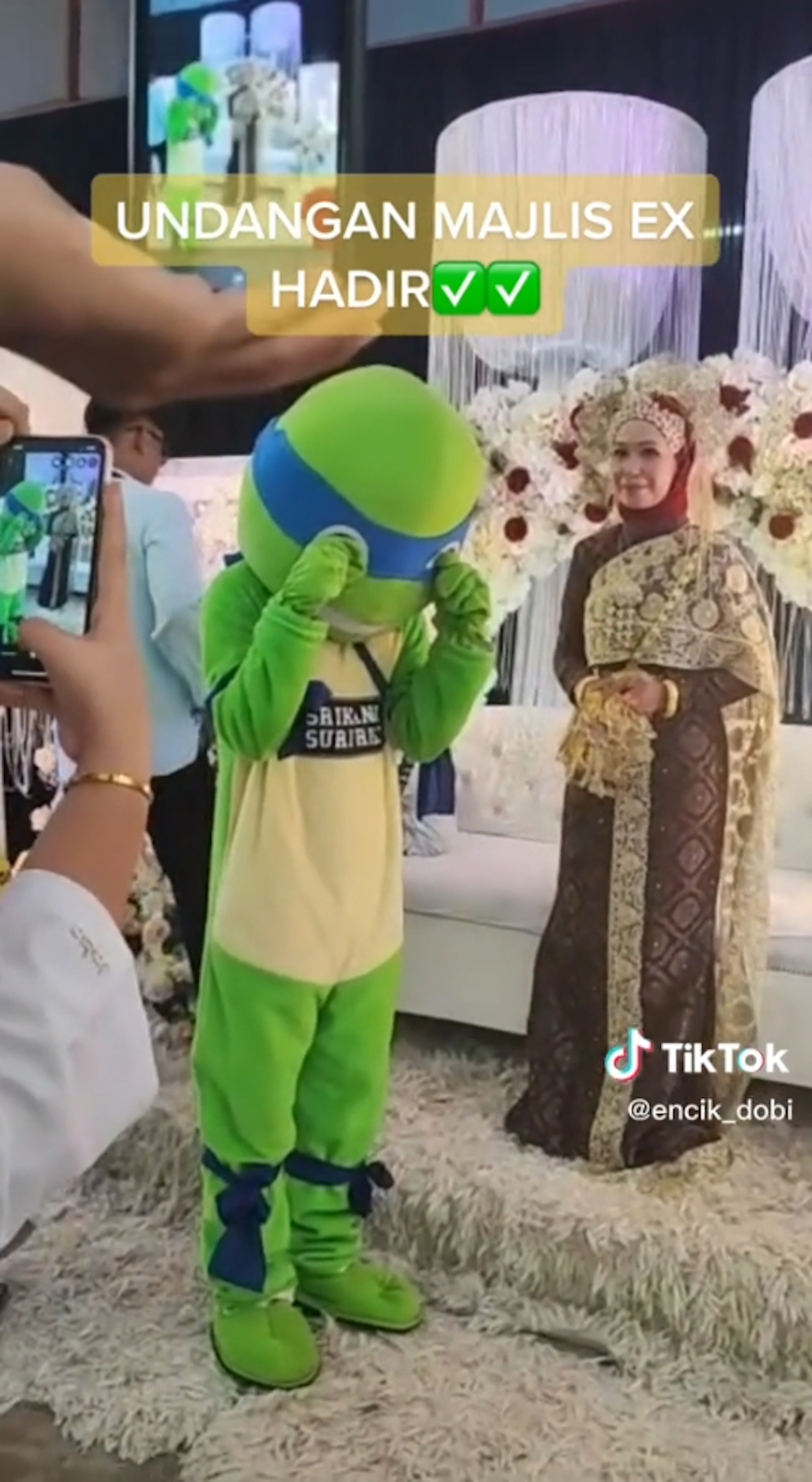 ' }; f% s% E5 m7 p6 @os.tvboxnow.com一名馬來西亞的男子與女友愛情長跑8年,但最後不幸以分手收場,沒多久後前女友嫁給了另外一人,他雖然感到十分悲傷,卻還是選擇去參加婚禮,不過他沒有去大鬧會場,而是穿上「忍者龜」布偶裝,以特別的方式為這天留下紀念。(TikTok@encik_dobi)