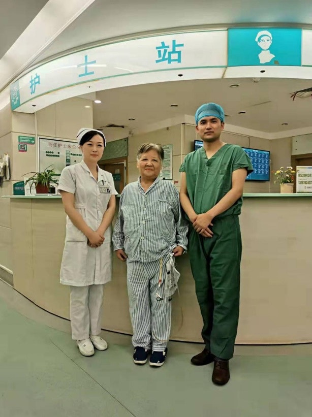 - @0 n6 I6 `. T* l涉事醫院網站一篇2019年7月的報道稱,劉翔峰(右)為一名八旬老婦(中)取出腹部巨大腫瘤,患者「緊緊握住劉翔峰副教授的手再三感謝」。(中南大學湘雅二醫院官網)公仔箱論壇2 I' ~( w) v# C; S1 O- \
