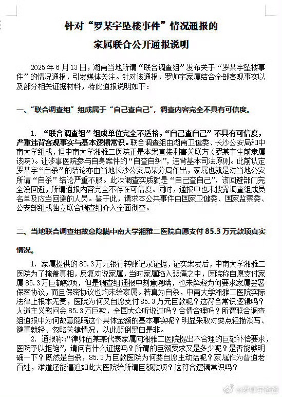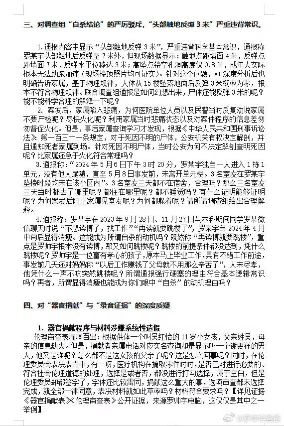 羅帥宇父母對官方通報作出逐點反駁,發佈了一份公開信。通報說羅帥宇頭部觸地後反彈至7米外,家屬公開信反駁說人體從15樓墜落地面後反彈3米的概率為零,根本不符合物理規律。