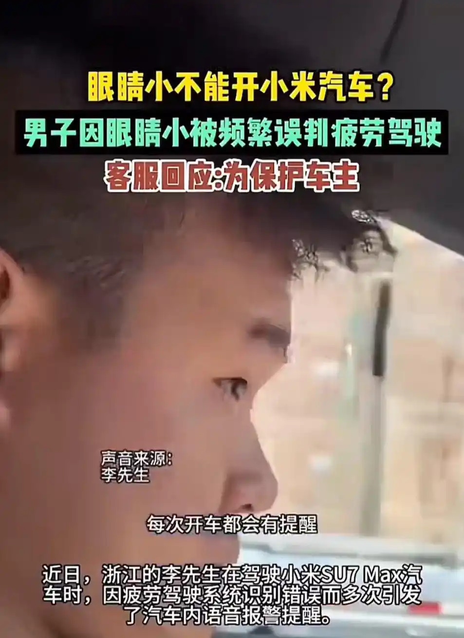 6月17日,內媒報道,近日,浙江的李先生在駕駛小米SU7 Max汽車時,因他本身眼睛小,所以疲勞駕駛系統識別錯誤,以為他睡著了,多次引發了汽車內語音警報提醒「請專注駕駛」。