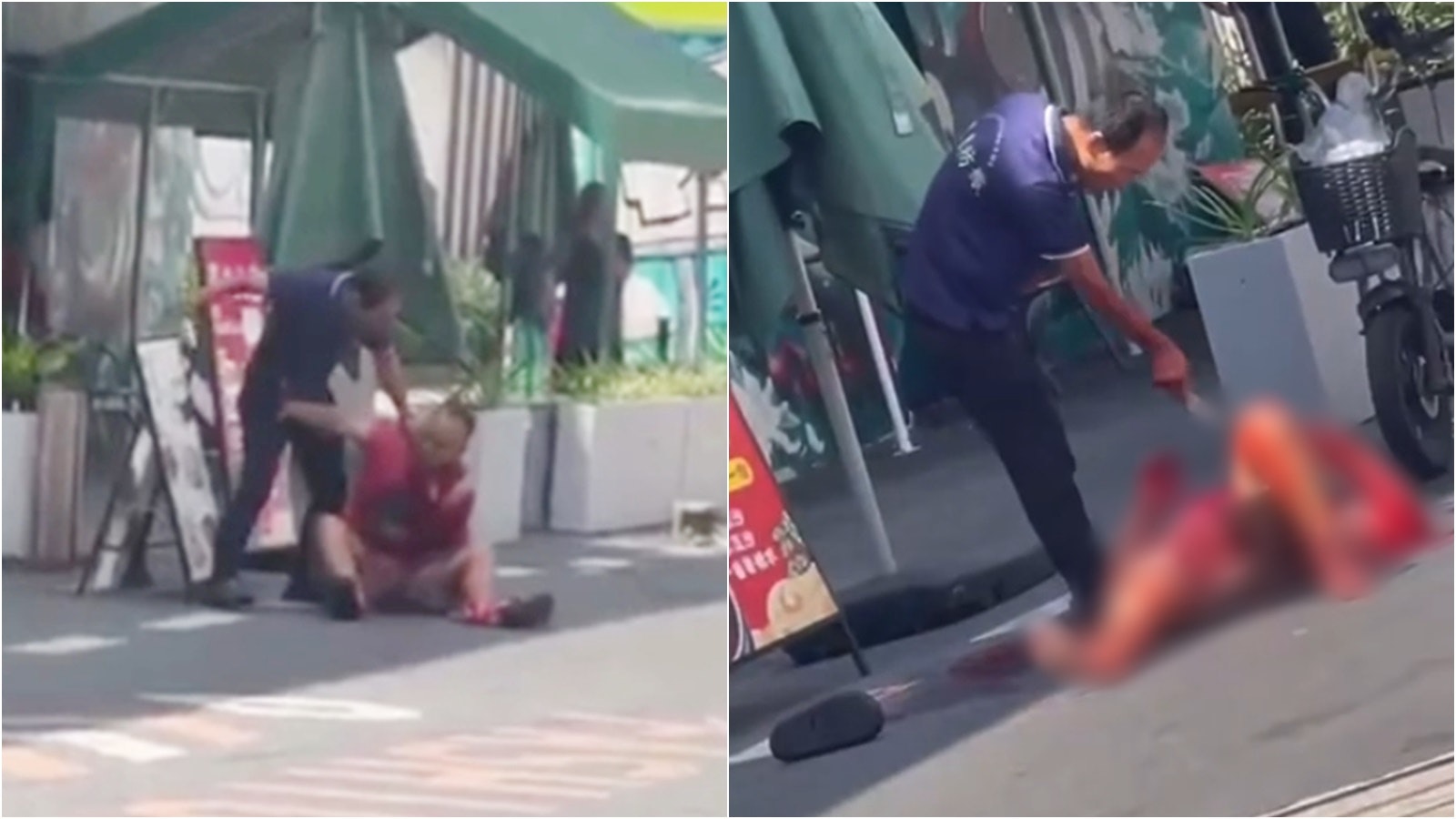 被刺男子倒在血泊中,傷人者並未離開。(影片截圖) |