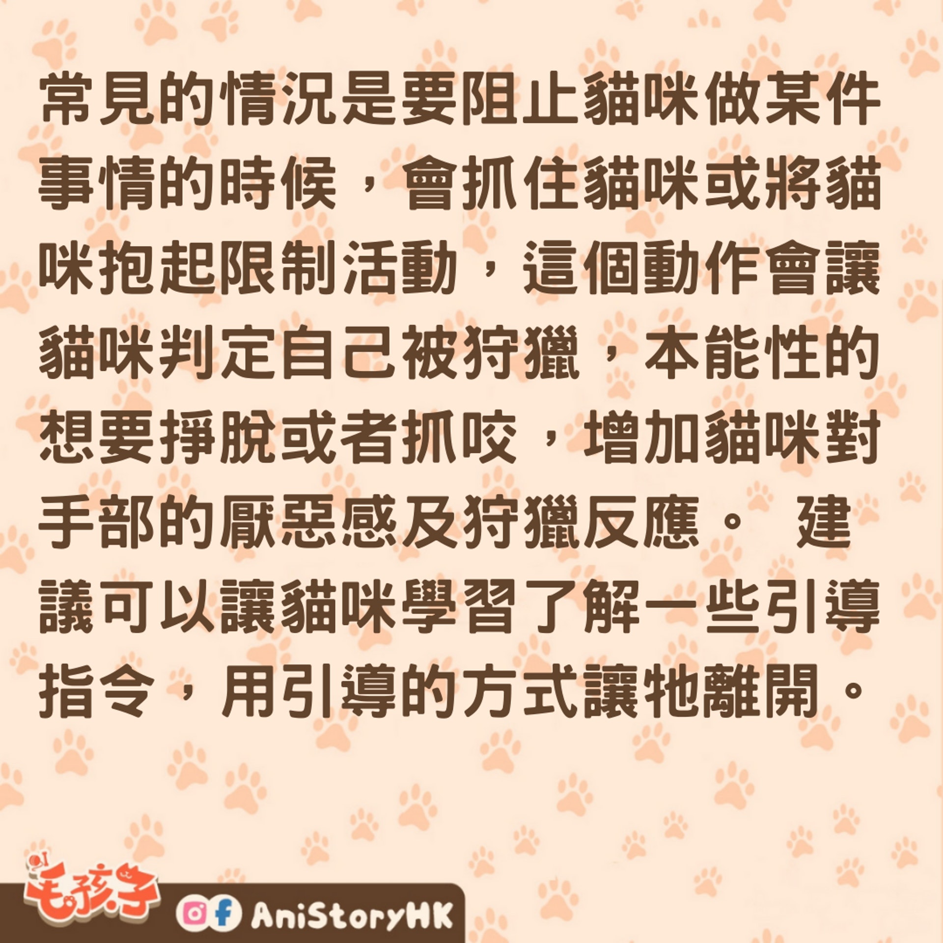 常⾒的情況是要阻⽌貓咪做某件事情的時候,會抓住貓咪或將貓咪抱起限制活動,這個動作會讓貓咪判定⾃⼰被狩獵,本能性的想要掙脫或者抓咬,增加貓咪對⼿部的厭惡感及狩獵反應。 建議可以讓貓咪學習了解⼀些引導指令,⽤引導的⽅式讓牠離開。