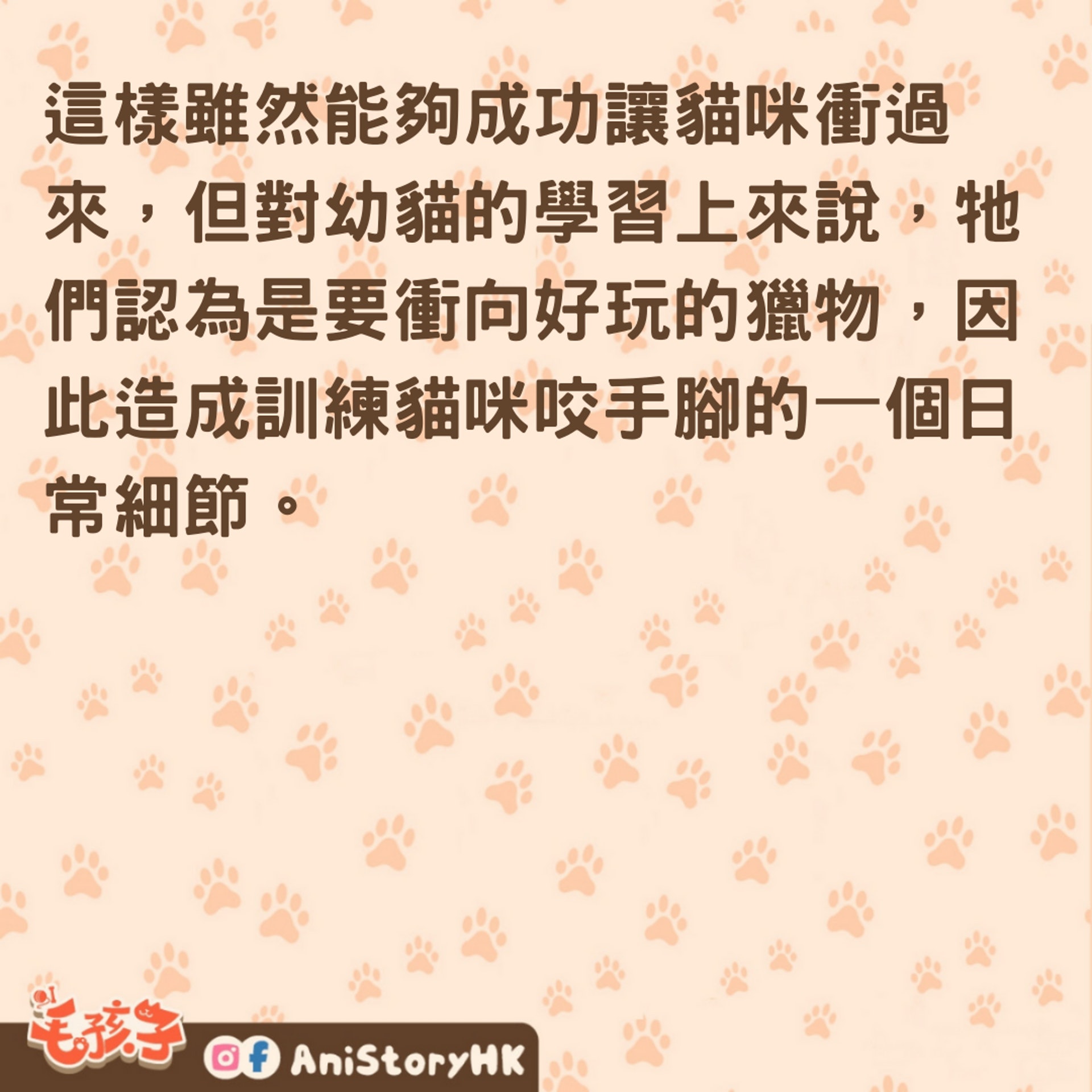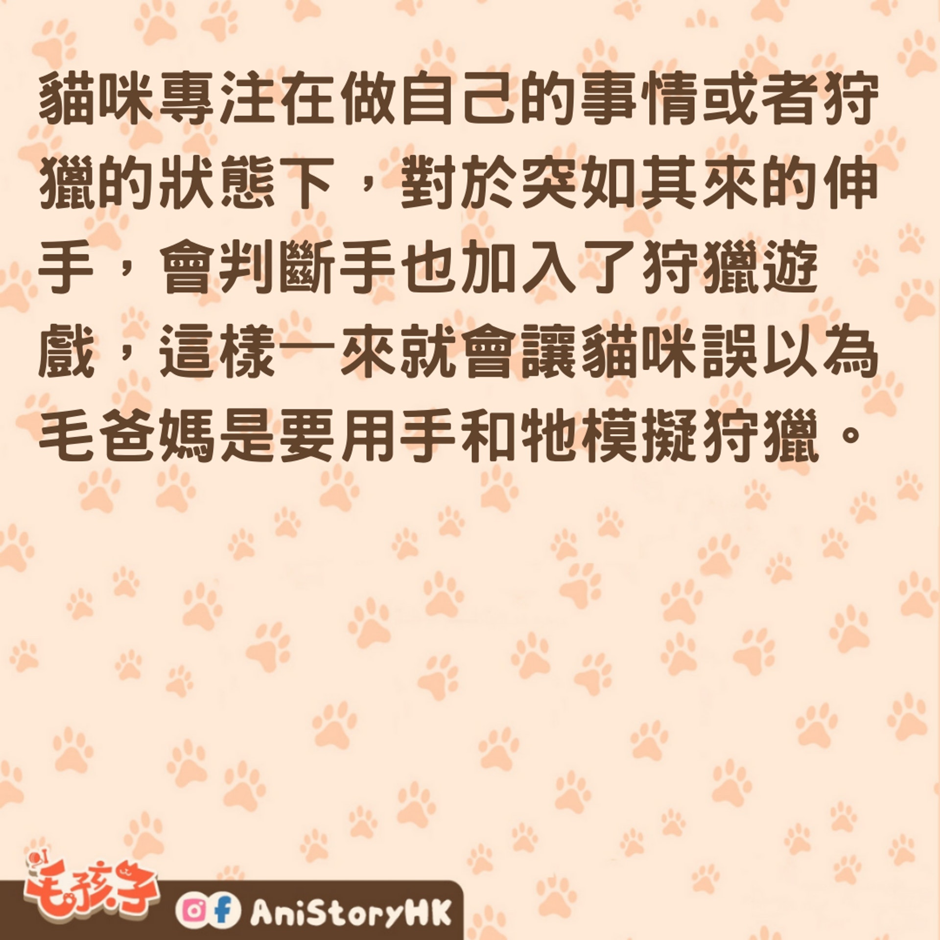 貓咪專注在做⾃⼰的事情或者狩獵的狀態下,對於突如其來的伸⼿,會判斷⼿也加入了狩獵遊戲,這樣⼀來就會讓貓咪誤以為毛爸媽是要⽤⼿和牠模擬狩獵。