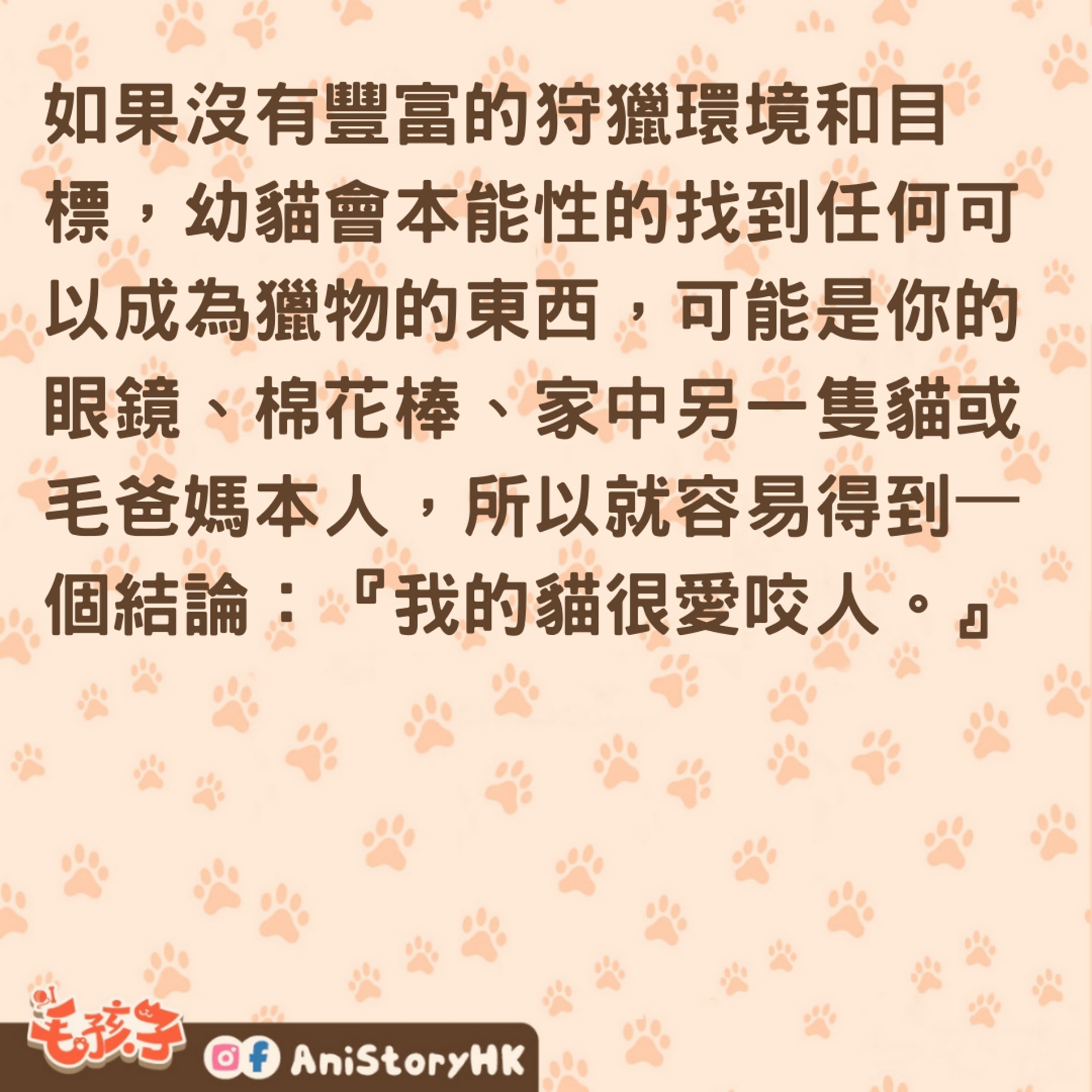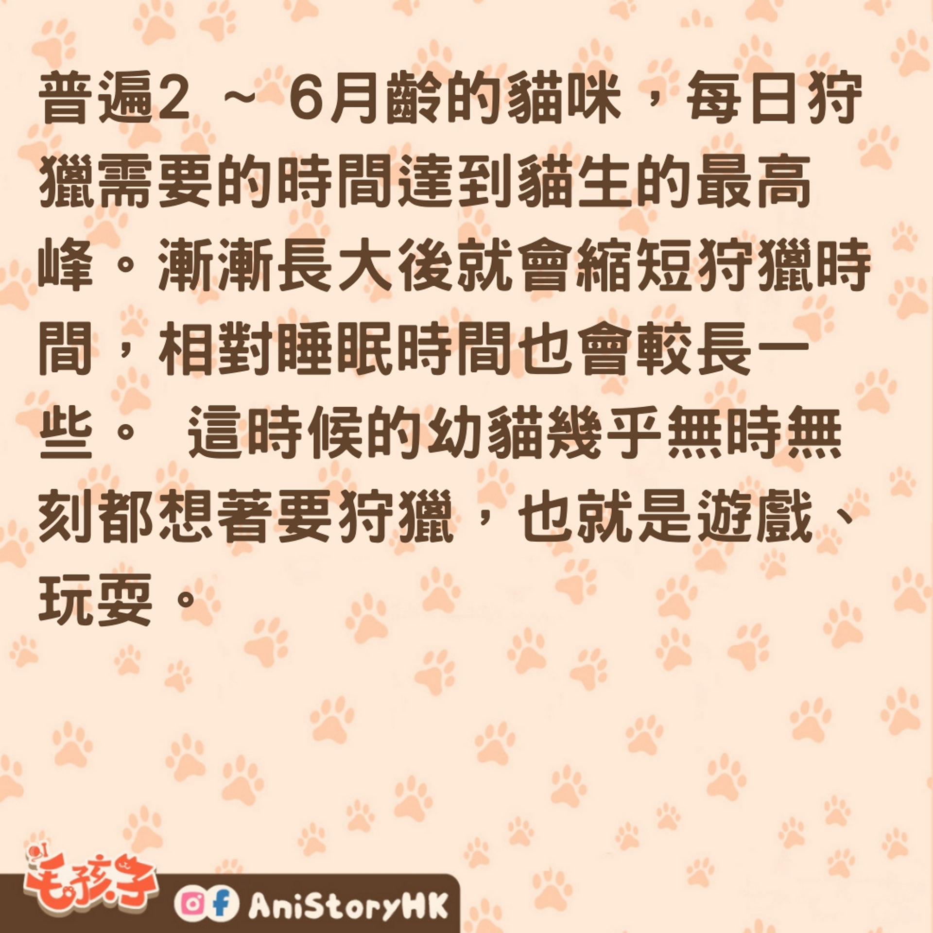 普遍2 ~ 6⽉齡的貓咪,每⽇狩獵需要的時間達到貓⽣的最⾼峰。漸漸長⼤後就會縮短狩獵時間,相對睡眠時間也會較長⼀些。 這時候的幼貓幾乎無時無刻都想著要狩獵,也就是遊戲、玩耍。如果沒有豐富的狩獵環境和⽬標,幼貓會本能性的找到任何可以成為獵物的東西,可能是你的眼鏡、棉花棒、家中另⼀隻貓或毛爸媽本⼈,所以就容易得到⼀個結論:『我的貓很愛咬人。』