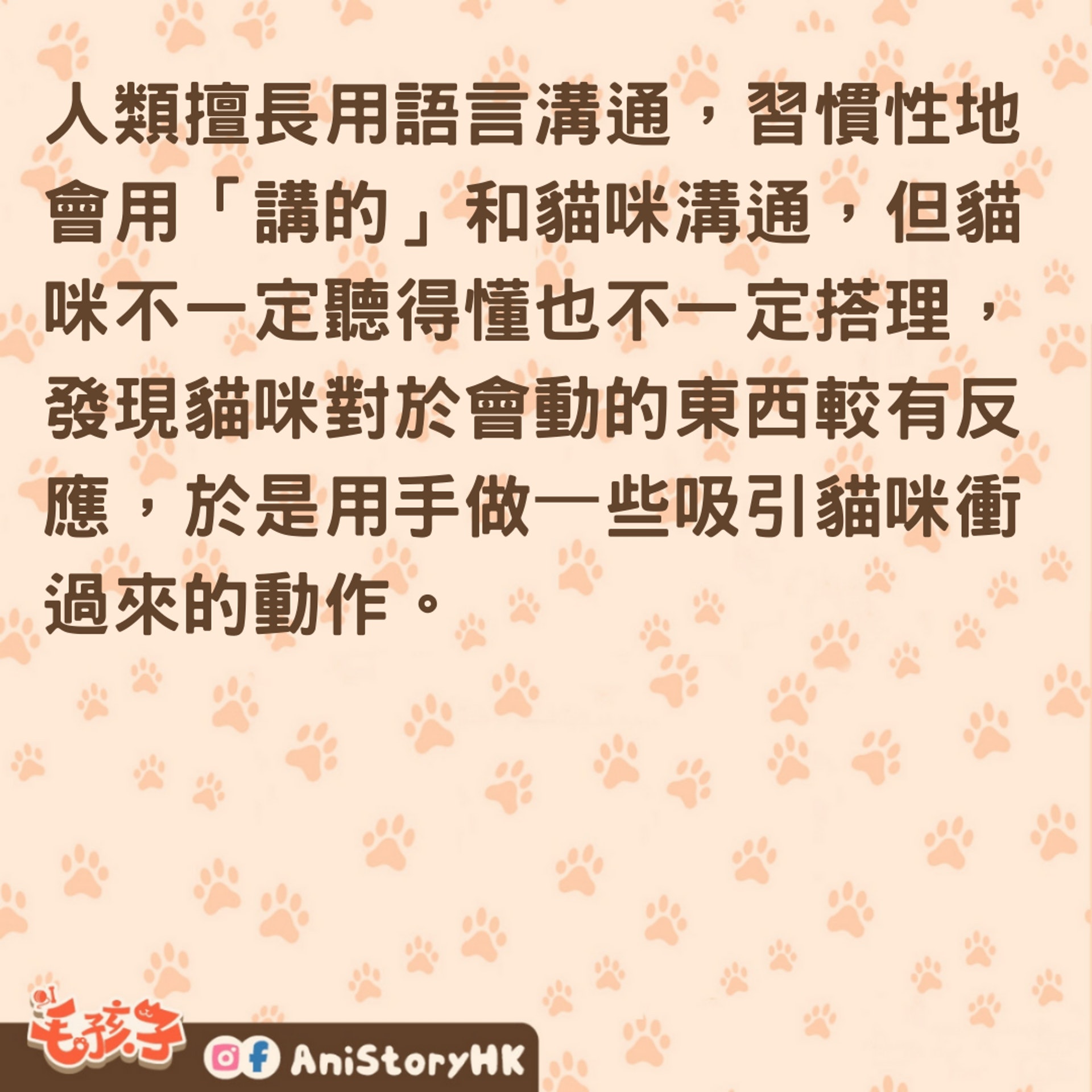 ⼈類擅長⽤語⾔溝通,習慣性地會⽤「講的」和貓咪溝通,但貓咪不⼀定聽得懂也不⼀定搭理,發現貓咪對於會動的東⻄較有反應,於是⽤⼿做⼀些吸引貓咪衝過來的動作。這樣雖然能夠成功讓貓咪衝過來,但對幼貓的學習上來說,牠們認為是要衝向好玩的獵物,因此造成訓練貓咪咬⼿腳的⼀個⽇常細節。