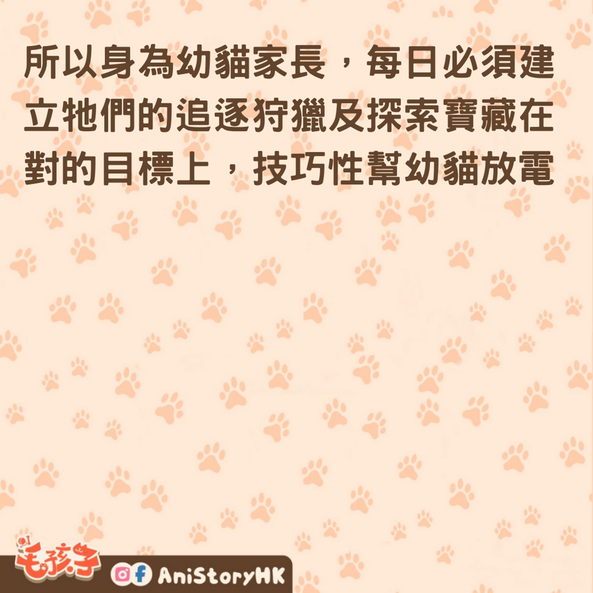 所以⾝為幼貓家長,每⽇必須建立牠們的追逐狩獵及探索寶藏在對的⽬標上,技巧性幫幼貓放電!