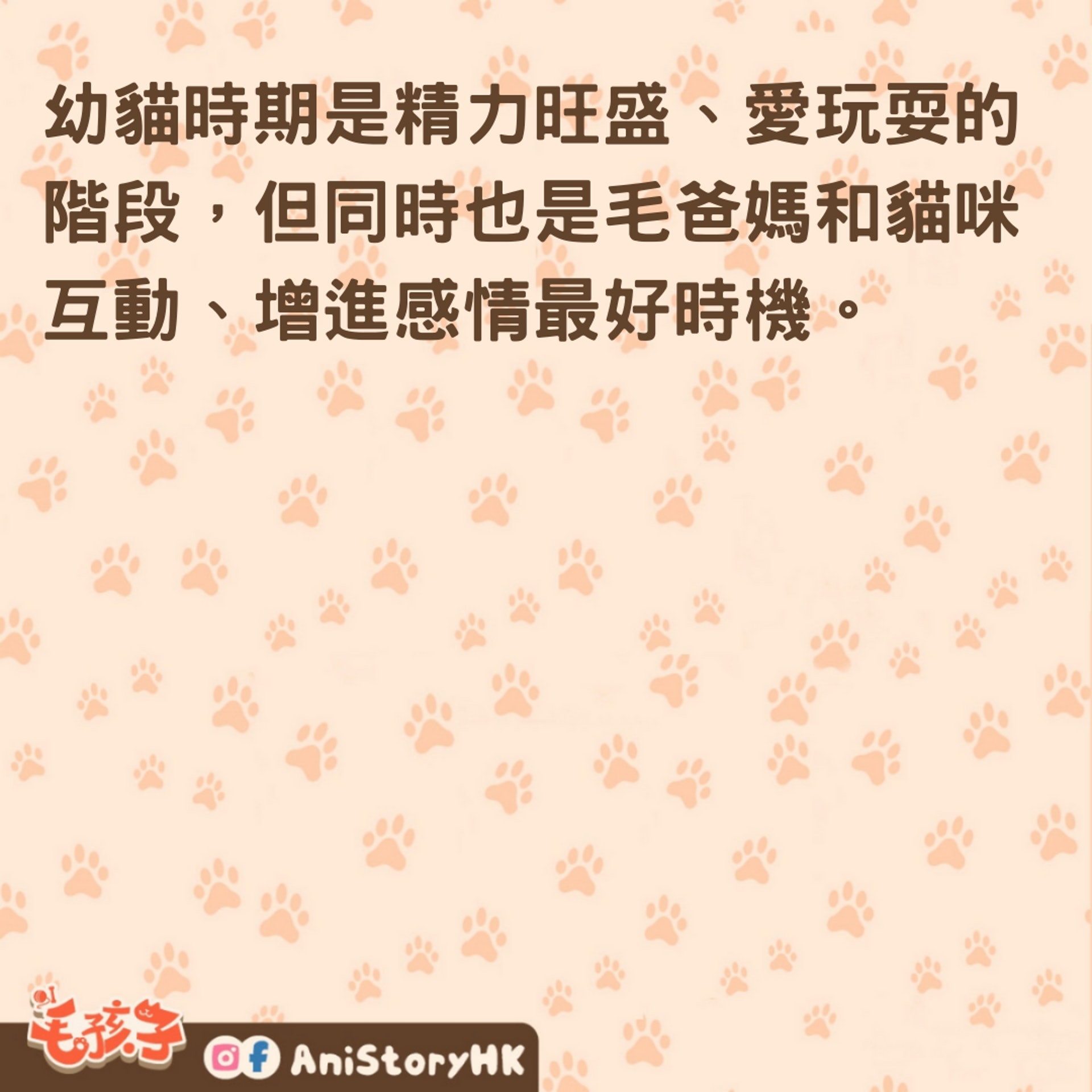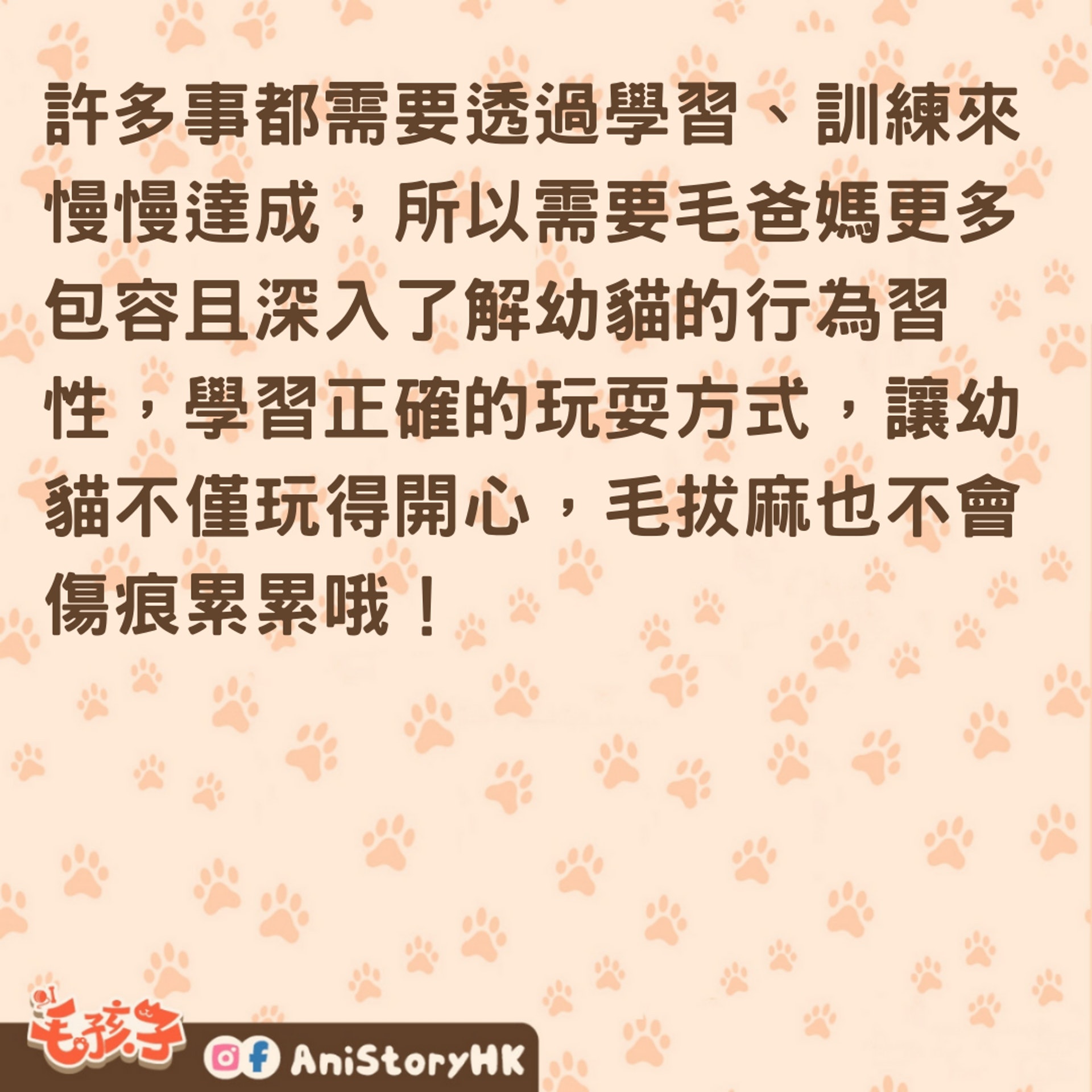 幼貓時期是精力旺盛、愛玩耍的階段,但同時也是毛爸媽和貓咪互動、增進感情最好時機。許多事都需要透過學習、訓練來慢慢達成,所以需要毛爸媽更多包容且深入了解幼貓的行為習性,學習正確的玩耍方式,讓幼貓不僅玩得開心,毛爸媽也不會傷痕累累哦! |