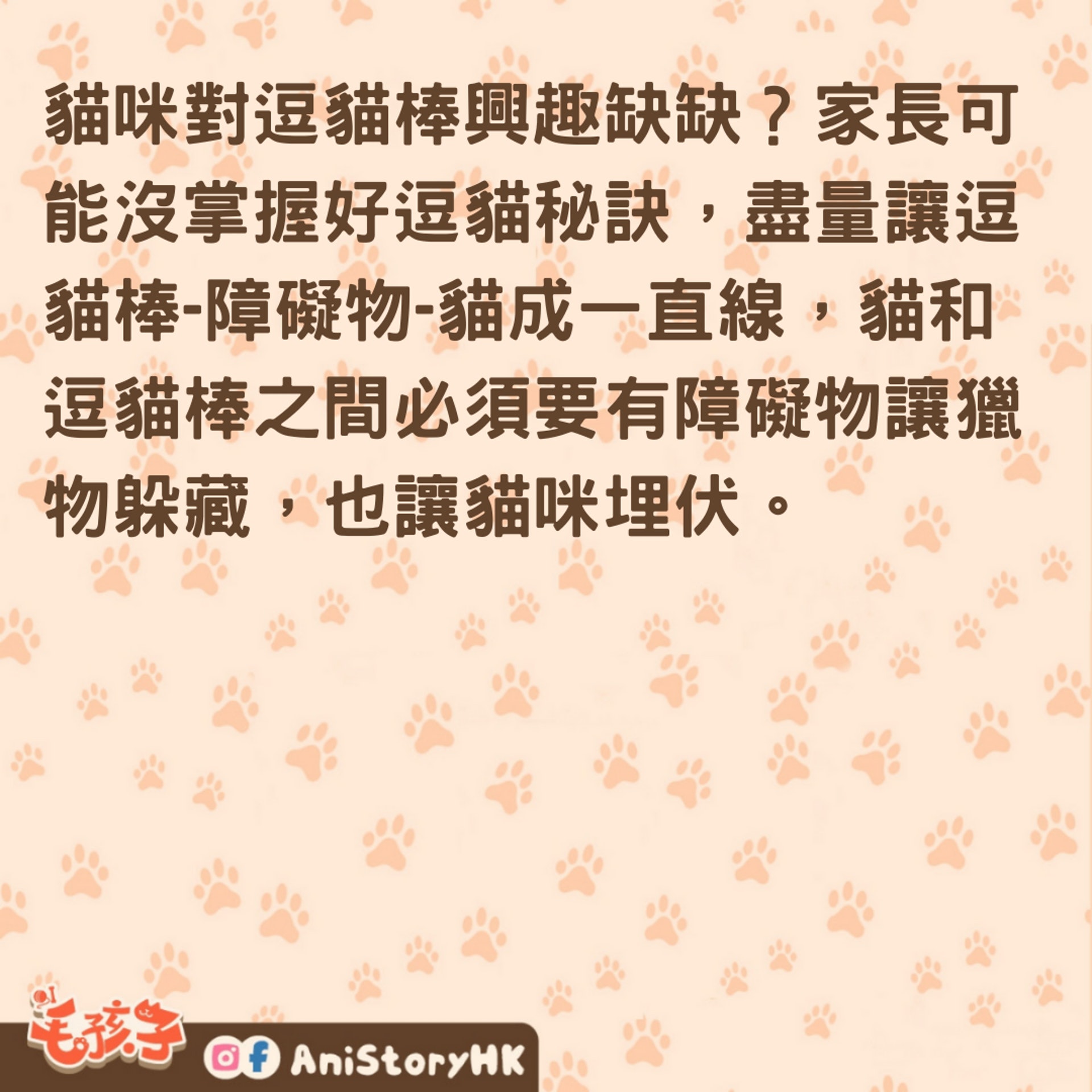 貓咪對逗貓棒興趣缺缺?家長可能沒掌握好逗貓秘訣,盡量讓逗貓棒-障礙物-貓成⼀直線,貓和逗貓棒之間必須要有障礙物讓獵物躲藏,也讓貓咪埋伏。逗貓棒給貓咪抓到以後,『等待』貓咪放⼿或者鬆⼝後,毛爸媽再重新揮動逗貓棒將獵物藏好。絕對不要和貓咪拉扯獵物,這樣會使貓咪認為抓不到或者資源不⾜⽽有挫敗感。