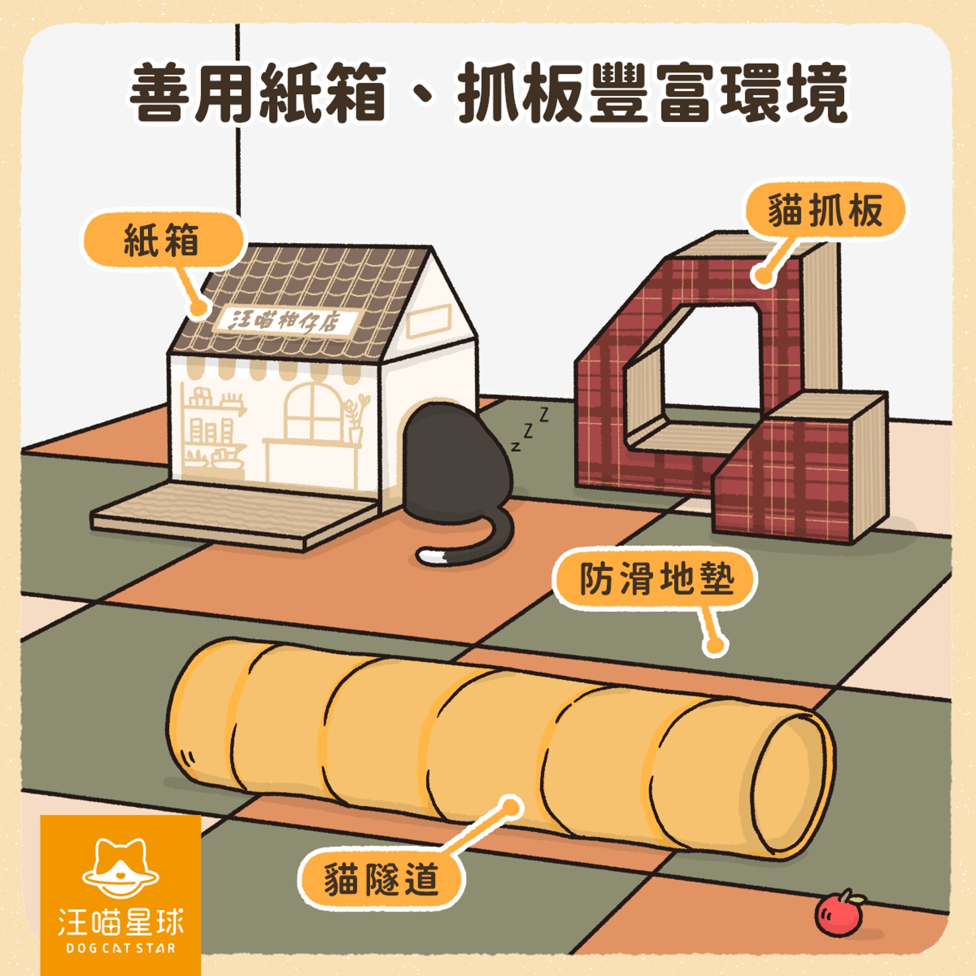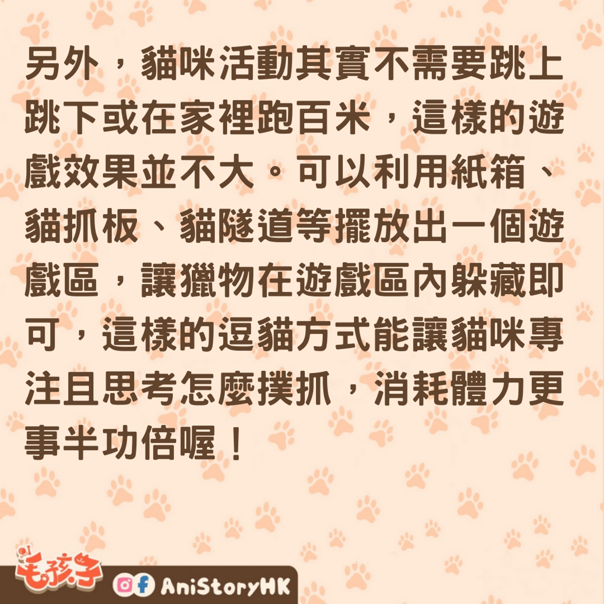 另外,貓咪活動其實不需要跳上跳下或在家裡跑百米,這樣的遊戲效果並不⼤。可以利⽤紙箱、貓抓板、貓隧道等擺放出⼀個遊戲區,讓獵物在遊戲區內躲藏即可,這樣的逗貓⽅式能讓貓咪專注且思考怎麼撲抓,消耗體⼒更事半功倍喔!