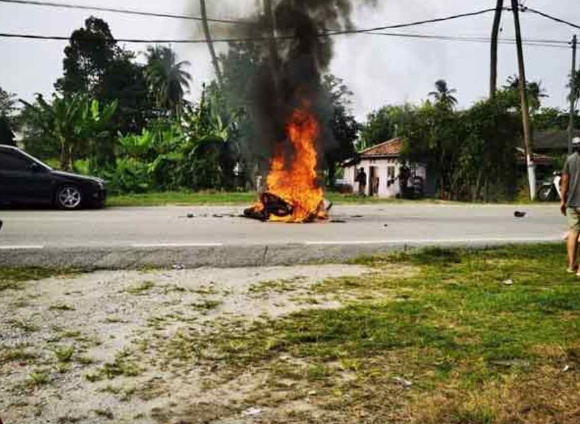 / f+ t7 F& W! s馬來西亞日前發生恐怖車禍,1名17歲男學生駕駛電單車想要超越前方泥頭車,結果被1輛反方向行駛的車輛迎面撞飛,再被泥頭車碾過,最終慘被起火的電單車火焰活活燒死。(網上圖片)