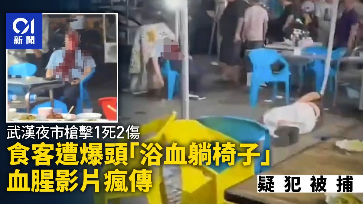 湖北武漢18日(周日)晚上一家燒烤店疑發生槍擊事件,多段血腥影片在網上瘋傳,可見有一人疑似頭部中彈,浴血躺在椅子上失去知覺,另有兩人受傷躺在地上,滿地血漬。os.tvboxnow.com2 j6 d' s# g# F3 [8 A2 G