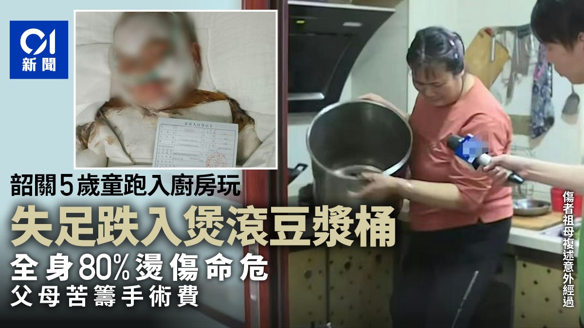j3 |/ g+ \ W1 ?2 oos.tvboxnow.com中國廣東省韶關市傳出一起憾事,一名年僅5歲的男童不慎跌入一桶剛煮沸的滾燙豆漿中,導致全身80%面積重度燒傷,目前仍在加護病房與死神拔河,由於醫療費用昂貴,家屬盼各界伸出援手。