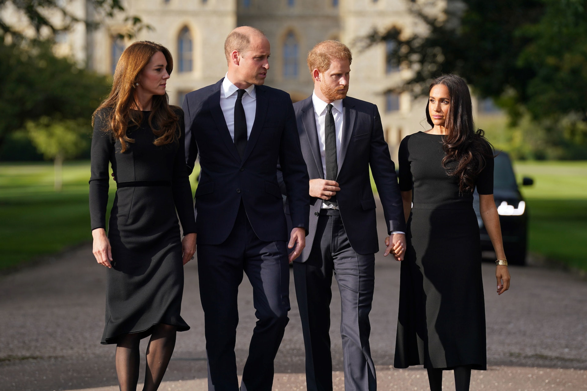 勞伯賈伯森透露,英女王過世後,威廉、哈里和凱特、梅根兩對夫妻一起走出溫莎堡向來弔唁的民眾致意,是凱特認為做過最艱難的事,因為實在忍不住對梅根的怒火。(GettyImages)