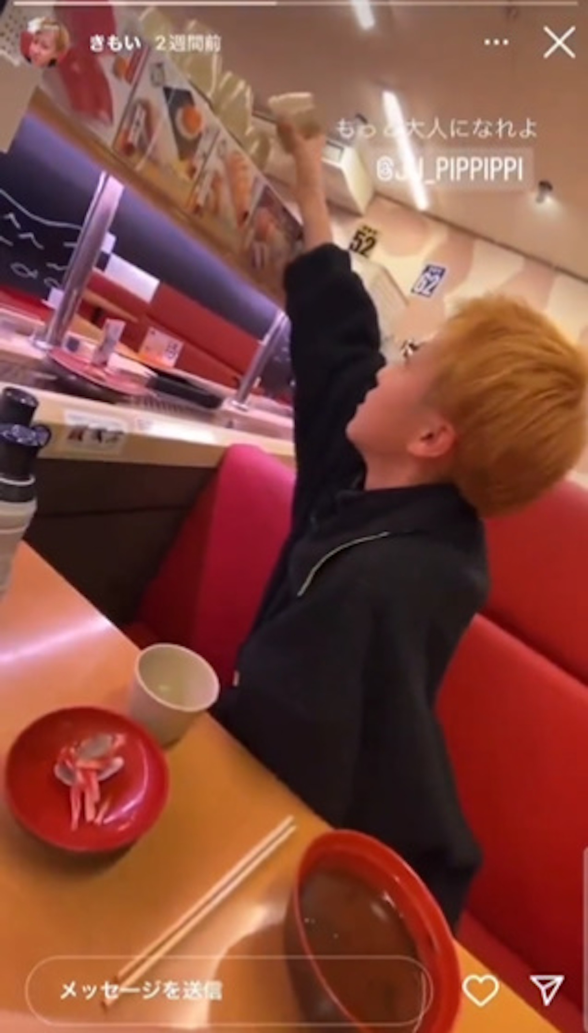 ; J/ g1 a8 q( m& @4 gtvb now,tvbnow,bttvb日本壽司郎一間分店遭金髮高中生惡搞,直接拿起豉油瓶、水杯或碗狂舔,甚至將口水沾在轉盤上的壽司,而影片曝光後也導致壽司郎母公司FOOD & LIFE COMPANIES股價大跌。(Twitter@takigare3)