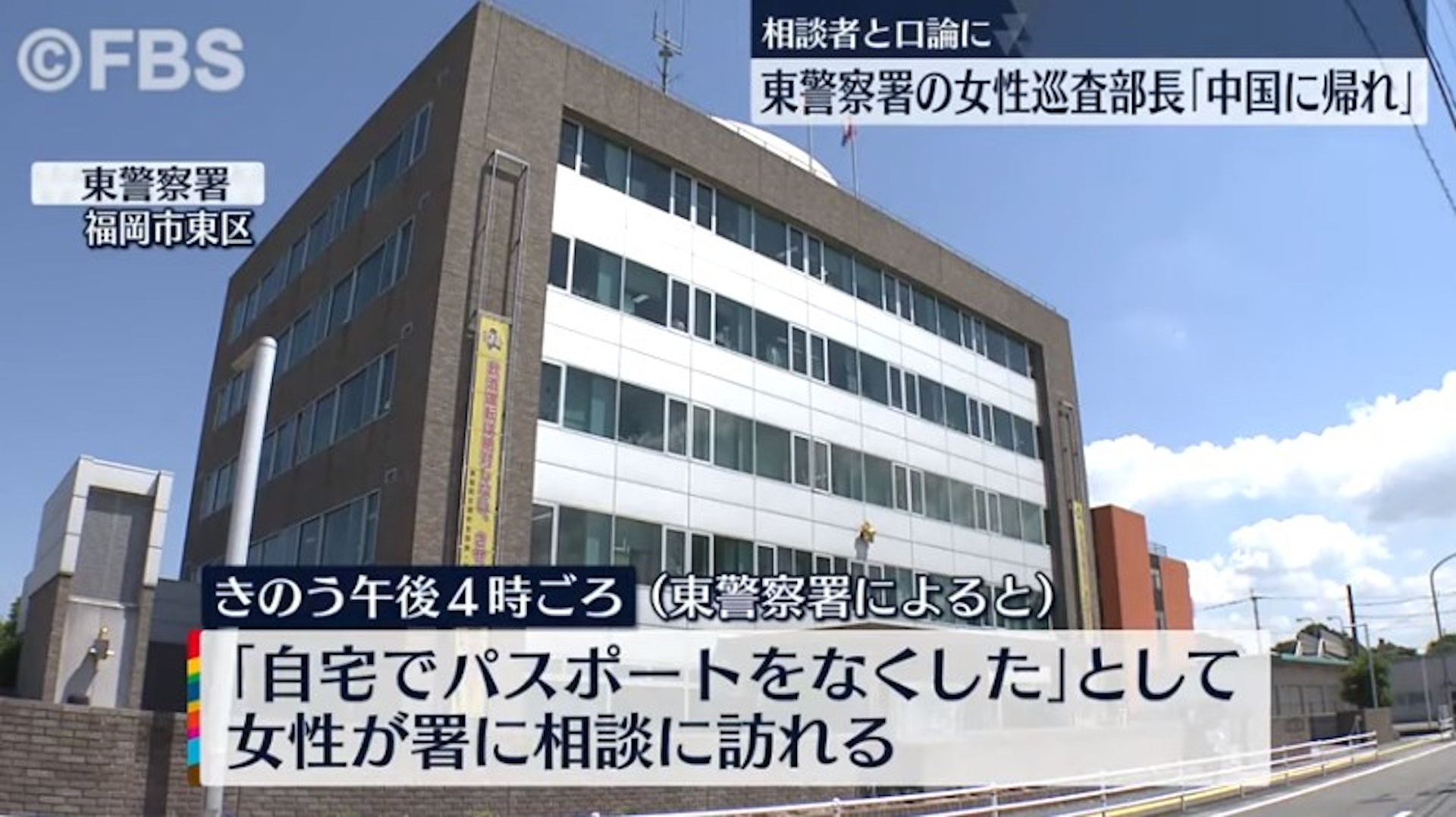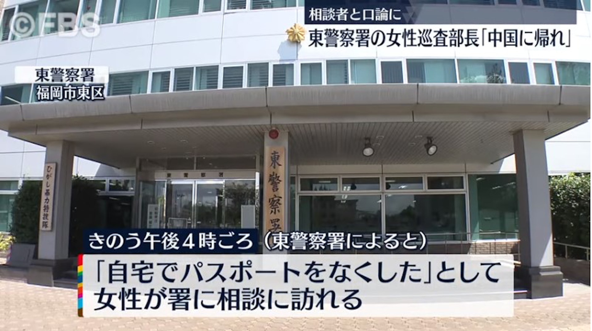 日媒6月16日稱,一名疑是外國籍的女子因在家中失去護照,15日下午4時向日本福岡縣東警署求助。雙方在溝通過程中發生爭執。有警官要求女子以日語說話,但她一直講中文,一氣之下向她喊「回中國去」。& O% ]1 v& Y4 x! D" O# W2 V