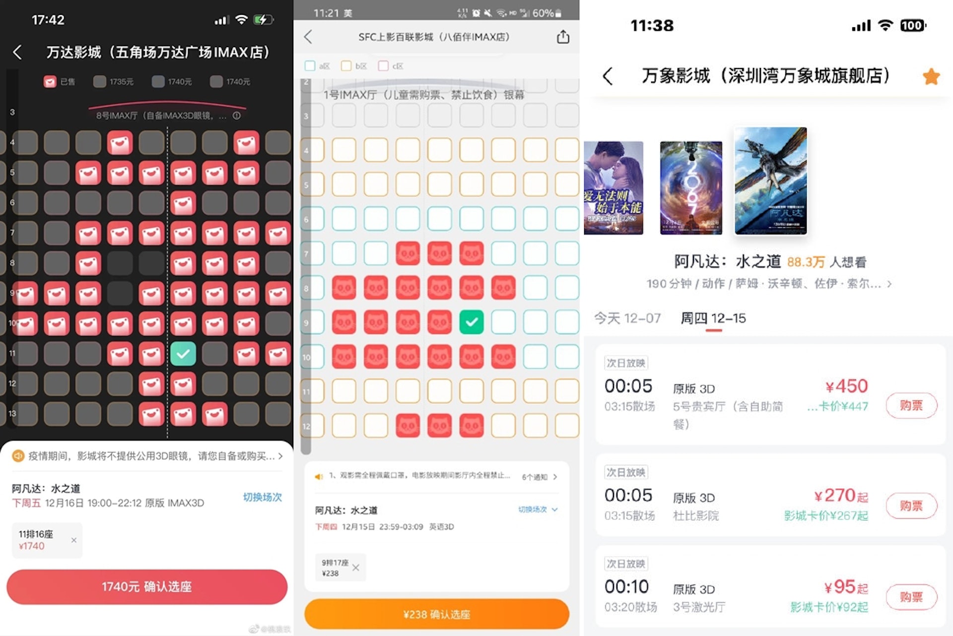 多地戲院也已開啟預售,但部分城市的票價卻令觀眾咋舌。上海有戲院的票價近2千元,深圳部分戲院為450元左右,成都、北京維持在100元上下。但濟南、合肥等城市票價合理,並無太大變動。據貓眼專業數據,截止7日下午2時,《阿凡達2》內地戲院平均票價71.8元。