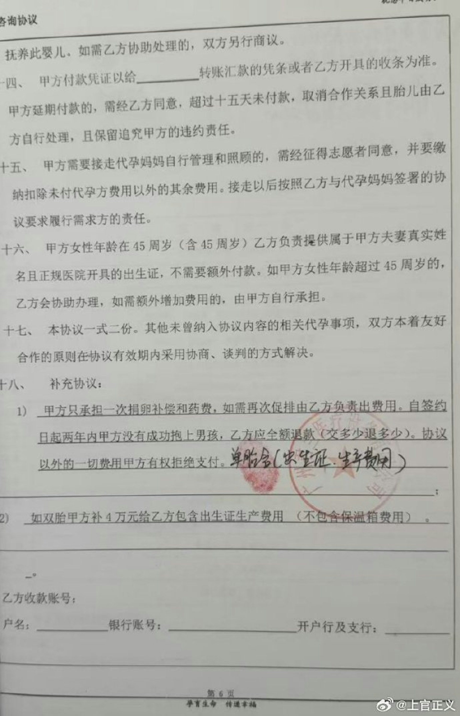 內地知名打拐志願者上官正義在微博發文稱,廣州一代孕結構提供案例,指一名07年5月出生的17歲彝族女孩,為已50歲江西永新籍的男子,今年2月2日在中山市小欖鎮產下雙胞胎。據該公司業務員介紹,因男方是指定的雙胎,最後支付共計費用在90多萬(人民幣,下同)。男方表示,他對於代孕媽媽還未成年的事情並不知情。4 Z& |8 k; X5 _