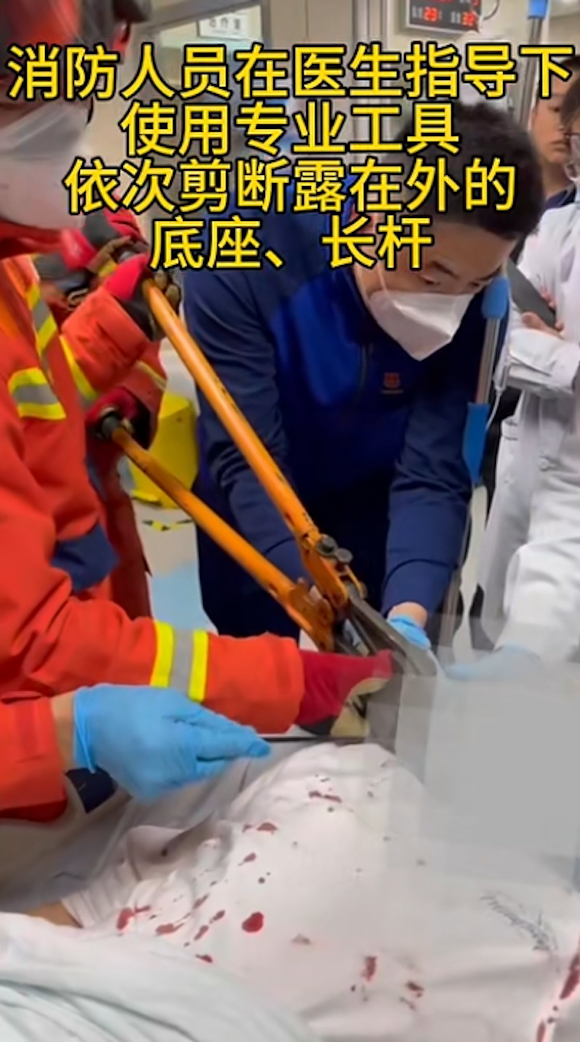 ' U6 P# Y& f) I/ |5 C- @消防剪掉金屬桿底座。(深圳大學總醫院)