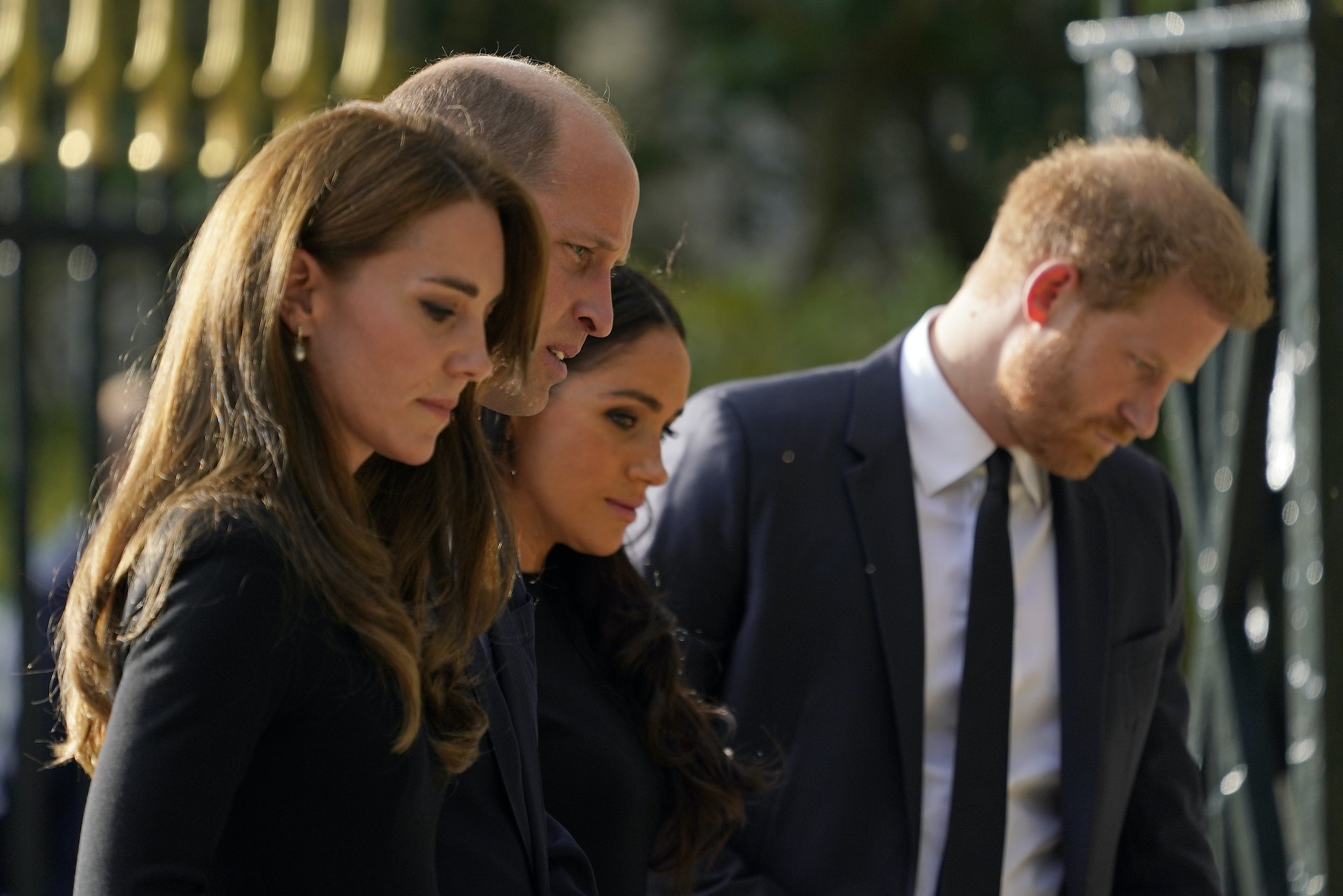 英女王逝世:威爾斯親王威廉王子和哈里王子夫婦9月10日現身溫莎堡,視察公眾對女王的悼念,並與他們交談。(AP)