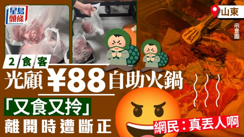 內地有網民5日發影片,指近日在山東濟南一間自助火鍋店,有2名食客「又食又拎」。, `) \9 S* @0 L2 l