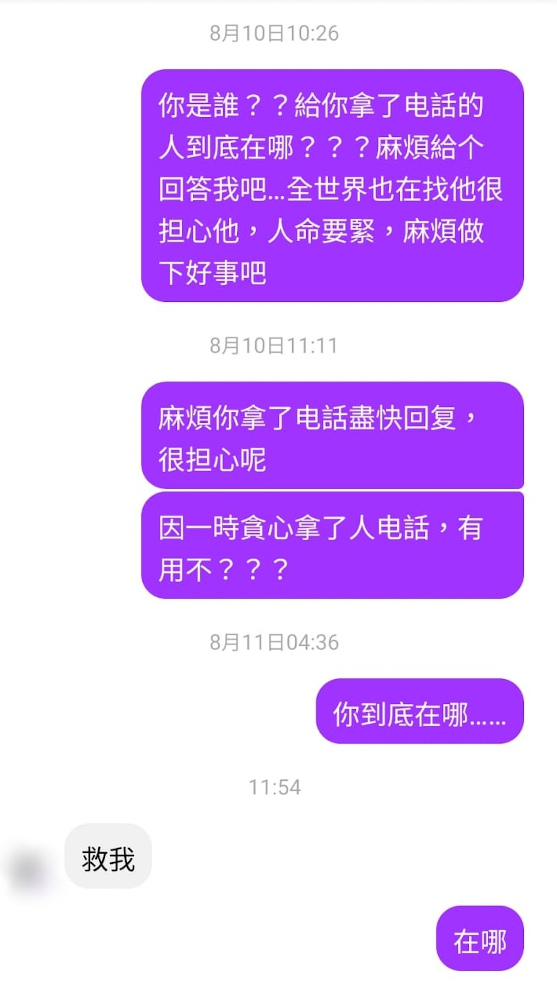 「男友」杰仔聲稱在8月9日下午5時會搭金巴前往香港找Peggy後失去聯絡。至11日她收到杰仔的訊息,不斷稱「救我,快來救我!」(讀者提供)
