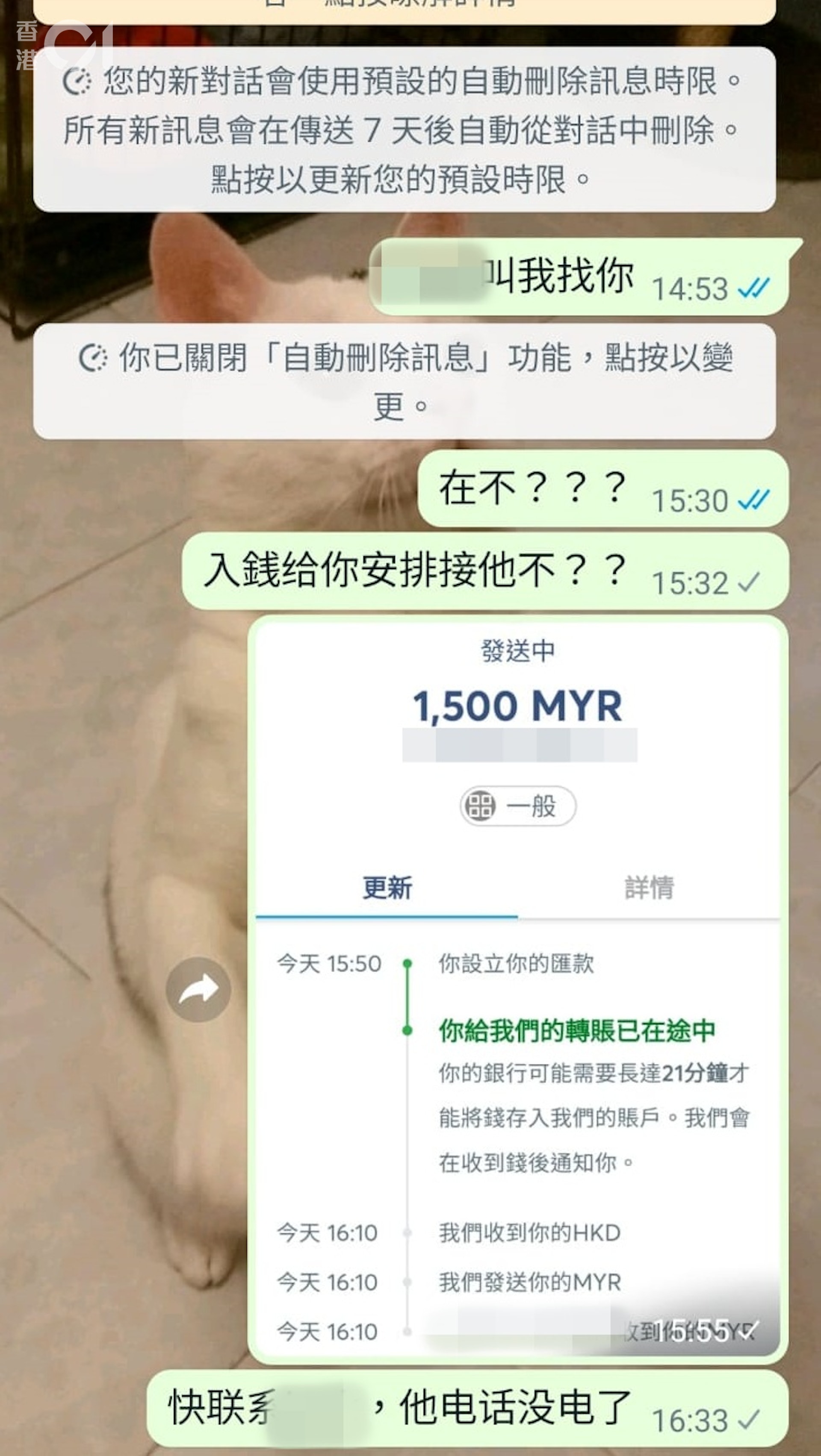 Peggy其後在whatsapp終與杰仔成功聯絡,他稱自己被困柬埔寨金邊詐騙營,並指自己已成功逃了出來,身無分文,向Peggy借錢1,500元馬幣(約2,600港元),用作偷渡到泰國,再前往馬來西亞。(讀者提供)os.tvboxnow.com6 L7 C0 k" _% K" f% i4 K) N1 }2 e