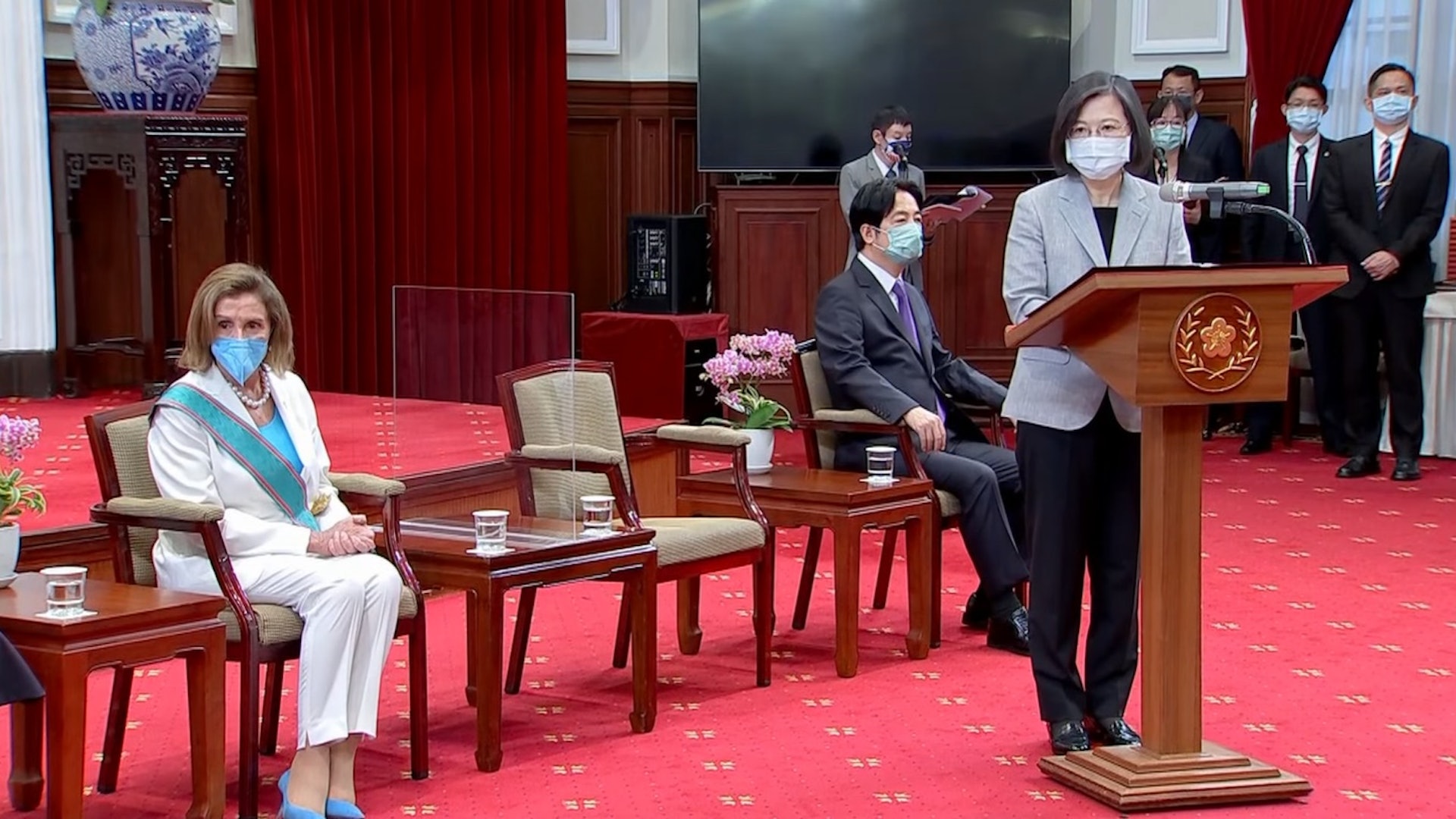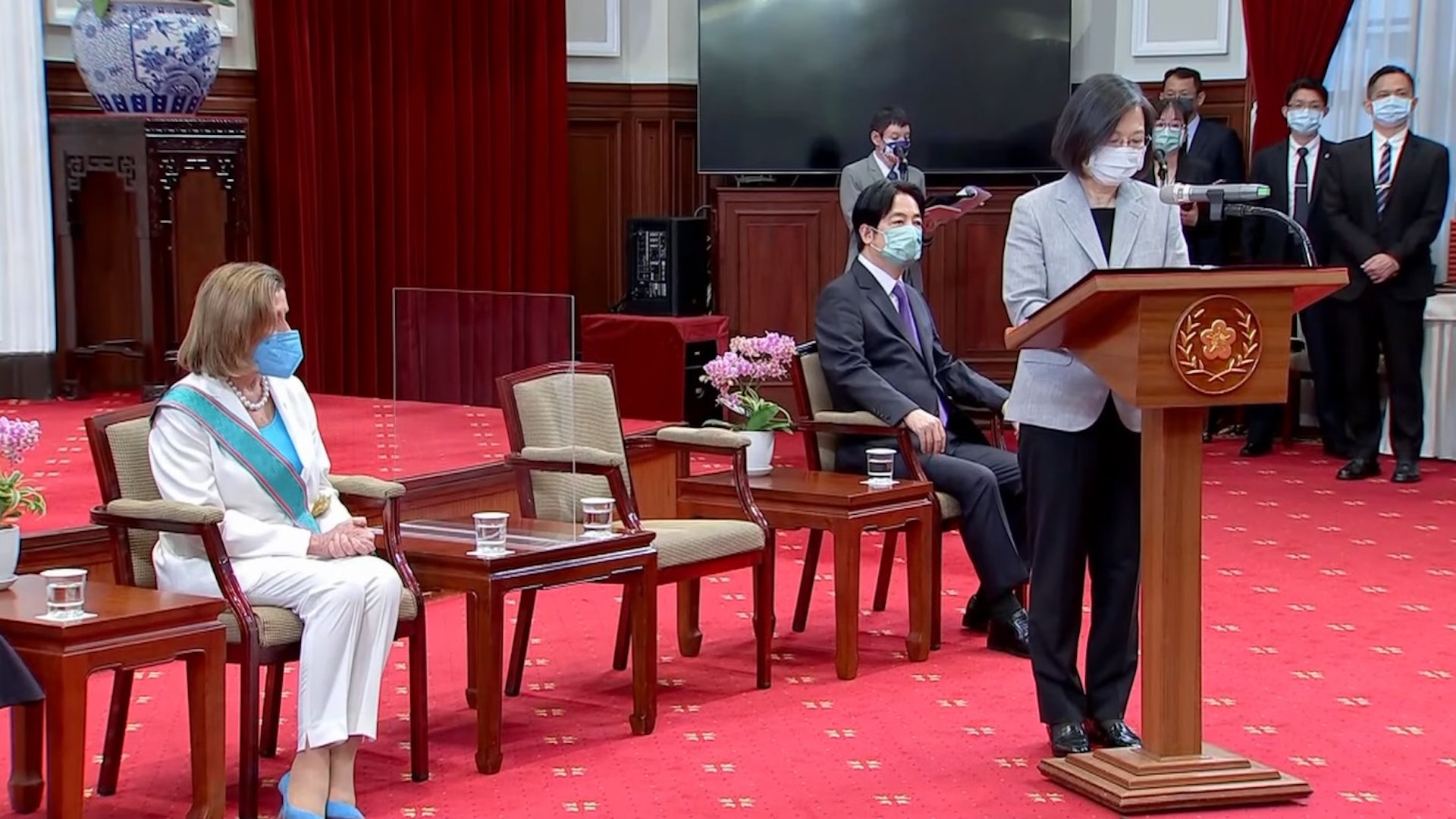 除在總統府接見佩洛西一行外,蔡英文也頒授佩洛西「特種大綬卿雲勳章」,表彰及感謝她對台灣長久以來的堅定支持,及對提升台美交流的卓著貢獻。. U( K3 Q2 i) d: T