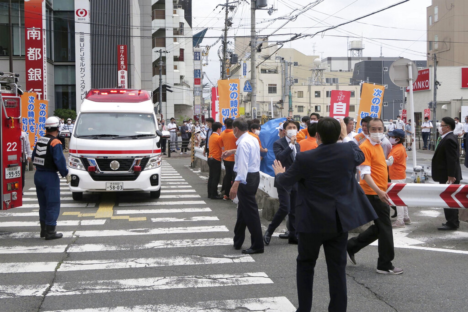 安倍晉三遇刺:日本前首相安倍晉三2022年7月8日早上在奈良近鐵大和西大寺站外進行拉票演講時被人開槍射擊,已被送到附近的一家醫院。圖為影片截圖,相中的安倍已中槍倒地,有人在旁確認他的情況。(AP)* J3 }+ }8 j( l, c; [) f